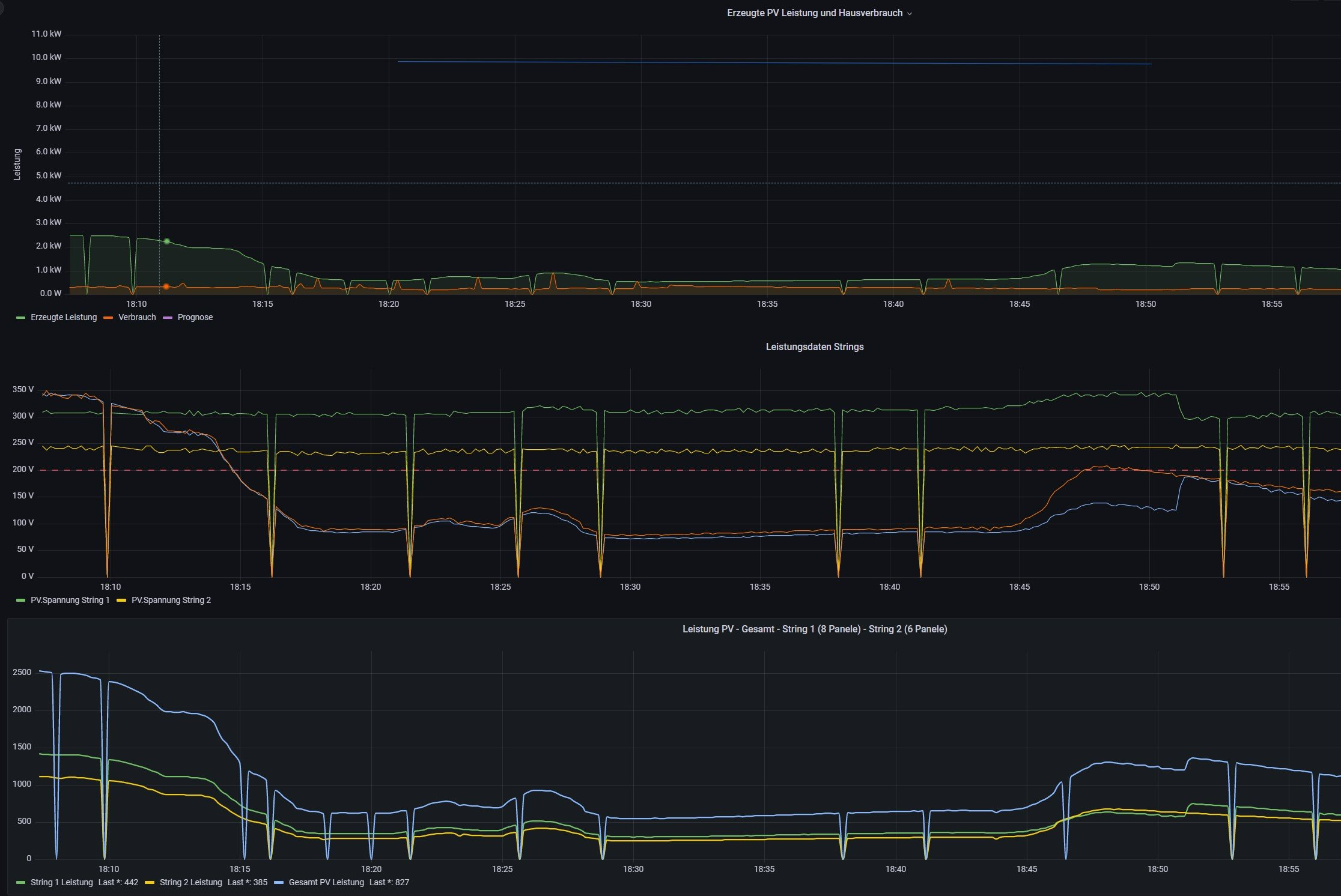 Hierbei ist mir aufgefallen, dass der WR lt. den Auswertungen doch ein recht "absurdes" Verhalten an den Tag legt. Betrachtet man die Auswertungen, so fallen die Werte für Strom, Spannung und Leistung immer wieder auf den Nullpunkt, während der WR gleichzeitig in die "Startup" Phase springt.