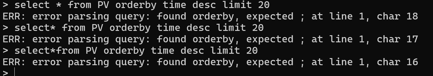 Bei der Influx Abfrage wird orderby nicht zusammen geschrieben. Deswegen die Fehlermeldung!