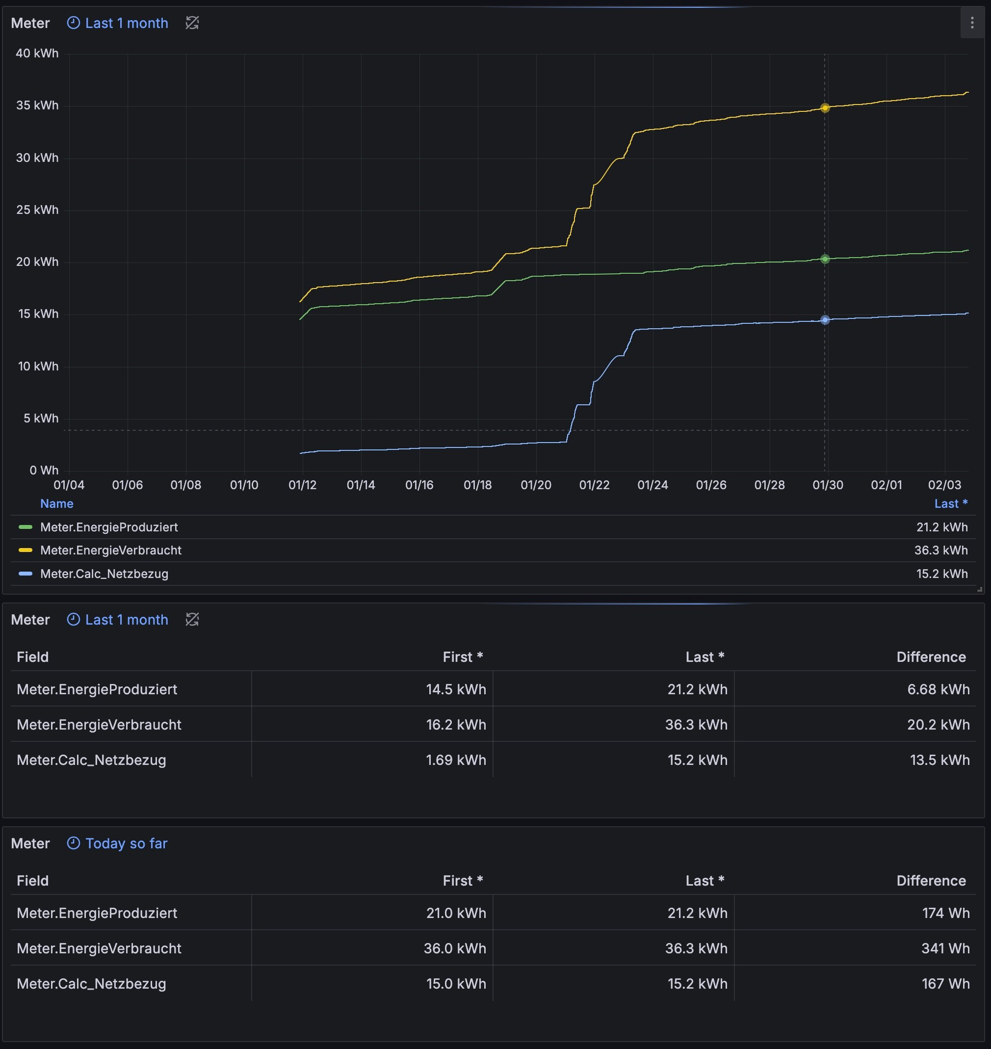 Die errechnete Differenz daraus nenne ich in meinen Beispielen Meter.Calc_Netzbezug. Diese Werte passen dann auch sehr gut mit dem zusammen, wie sich der Zählerstand des SmartMeters vom Netzbetreiber verändert hat.
