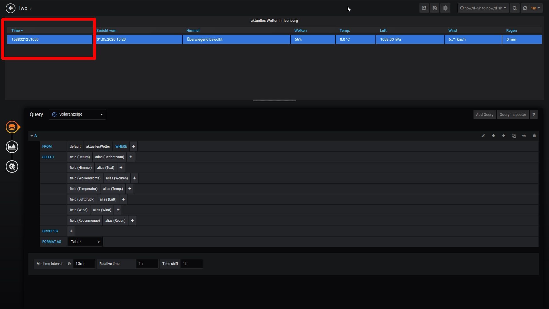 3.) Er legt jetzt alle halbe Stunde eine neue Zeile an. Das bekomme ich Grafana nicht abgewöhnt.