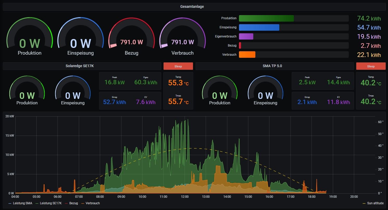 Der SE-WR (WR1) hat einen Zähler am Netzübergabepunkt (Bezug / Einspeisung). Der SMA-WR (WR2) hat keinen externen Zähler, ich kenne also nur dessen aktuelle Produktion. Es ist eine Zählerkaskade (keine Auslesung durch Solaranzeige!!) geschaltet, wodurch erst die Erzeugung des SMA-WR verbraucht wird und nur wenn die nicht reicht, wird auch Erzeugung des SE-WR mit selbst verbraucht. Die Einspeisung des SMA-WR gibt 30 % weniger Vergütung, als die vom SE-WR. Deswegen möchte ich zukünftig dann den Verbrauch möglichst gut in die Erzeugung des SMA-WR legen. Im Anhang dann die komplette php, mit der ich dann noch zusätzliche Werte in die Datenbank vom WR1 schreiben will. Manches könnte man sicherlich auch in Grafana direkt berechnen, aber so erscheint mir der Zugriff auf die Werte aus verschiedenen Panels einfacher.