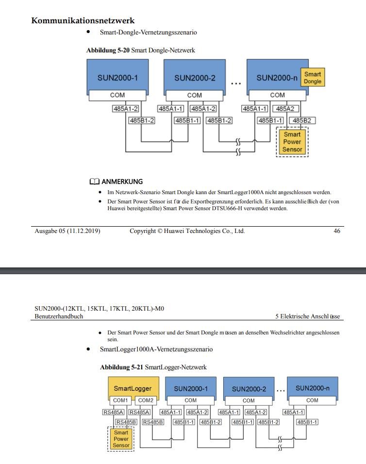 Sind die Wechselrichter untereinander Verbunden wird es schwieriger. Einen MASTER kann kein MASTER auslesen. Jetzt musst du wissen, wen du in dem Verbund als Master eingestellt hast. An dieses Gerät muss die Solaranzeige angerschlossen werden, unter der Bedingung, das dieses Geräte einen speziellen Anschluß für einen 2. MASTER hat. Es muss also vorbereitet sein, das es MASTER und SLAVE gleichermaßen ist und die Daten, die es als Master sammelt parallel als Slave zur Verfügung stellt. Es gibt Mitglieder die das in Betrieb haben. Ob der "MASTER/SLAVE" ganz bestimmte Hardware benötigt und bestimmte Software kann ich nicht sagen. Der SmartMeter von Huawei kann das aber. An diesem Punkt muss der Huawei Support helfen oder Mitglieder die sich mit der Kaskadenverschaltung der HUAWEI Geräte gut auskennen. Es gibt auch Dokumente von Huawei, die die Kaskadenverschaltung genau beschreiben. An dem Umfang dieser Dokumente siehst du aber, dass das alles nicht ganz so einfach ist.