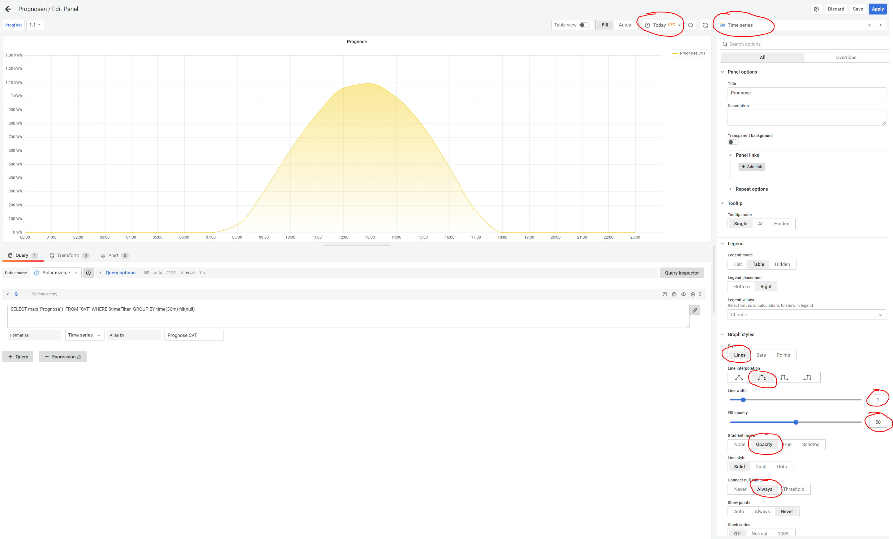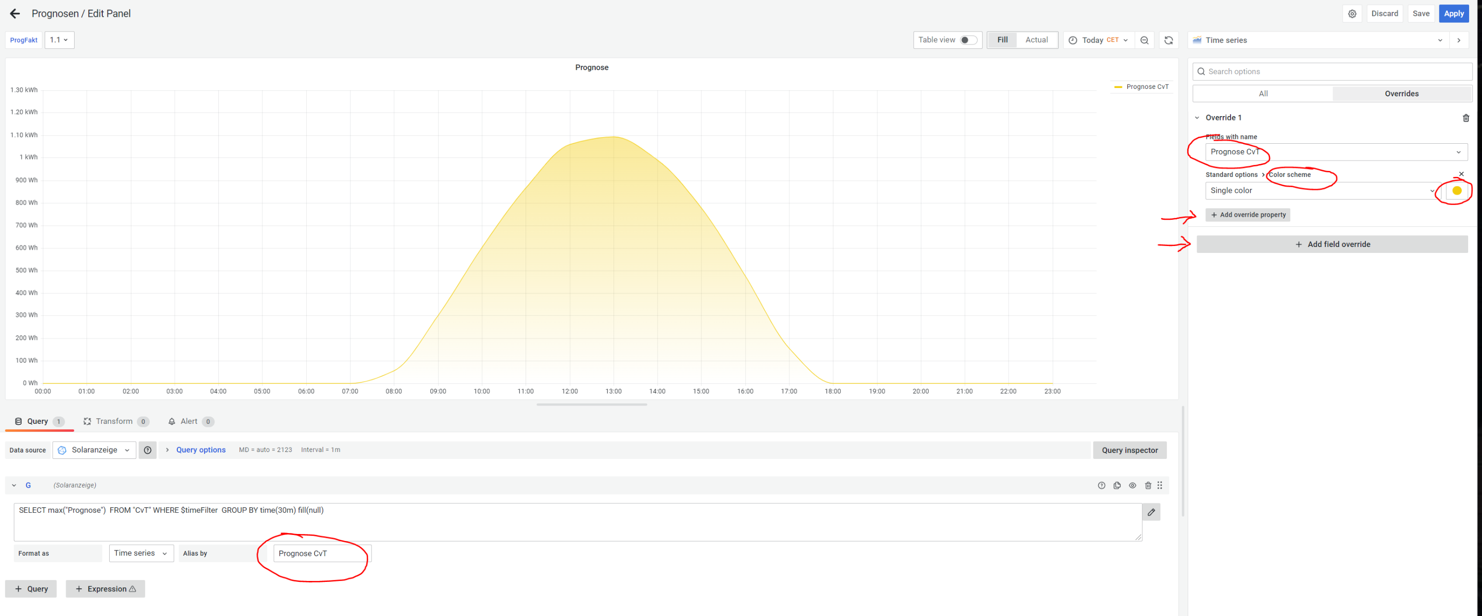 Also zuerst ein neues Panel anlegen und dann rechts oben TimeSeries auswählen. Dann Deine Query erstellen. Danach die wichtigsten Einstellungen vornehmen: Hier die markierten (rot eingekreist) Einstellungen beachten. Bei der Query bitte Deinen Feldnamen und Dein Measurement entsprechend anpassen, ich habe meine eigenen Prognosen im Measurement CvT, daher passt es nicht ohne Anpassung für Dich. Anschließend unter Overrides (rechts oben unter der Panelauswahl) die gewünschten Einstellungen für die jeweilige Abfrage machen. Nachdem in der Darstellung ja auch mehrere verschiedene Abfragen gleichzeitig dargestellt werden können, kann hier z.B. die Optik (Farbe, Lines, Dashes, Points, Farbverlauf, gefüllt oder nicht und vieles mehr) jeder einzelnen Abfrage "überschrieben werden. Als Beispiel die Farbe Geld. Ansonsten einfach weiter experimentieren.