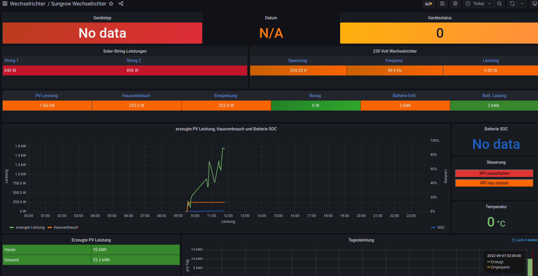 Also ich habe damals angefangen Dashboard etwas anzupassen, da so wie bei dir auch, machen die Felder für Batterie keinen Sinn bei "einfachen" Wechselrichter". Zusätzlich habe ich noch die Daten von dem Zähler eingebaut. Ist aber alles noch halb fertig und nicht dokumentiert...