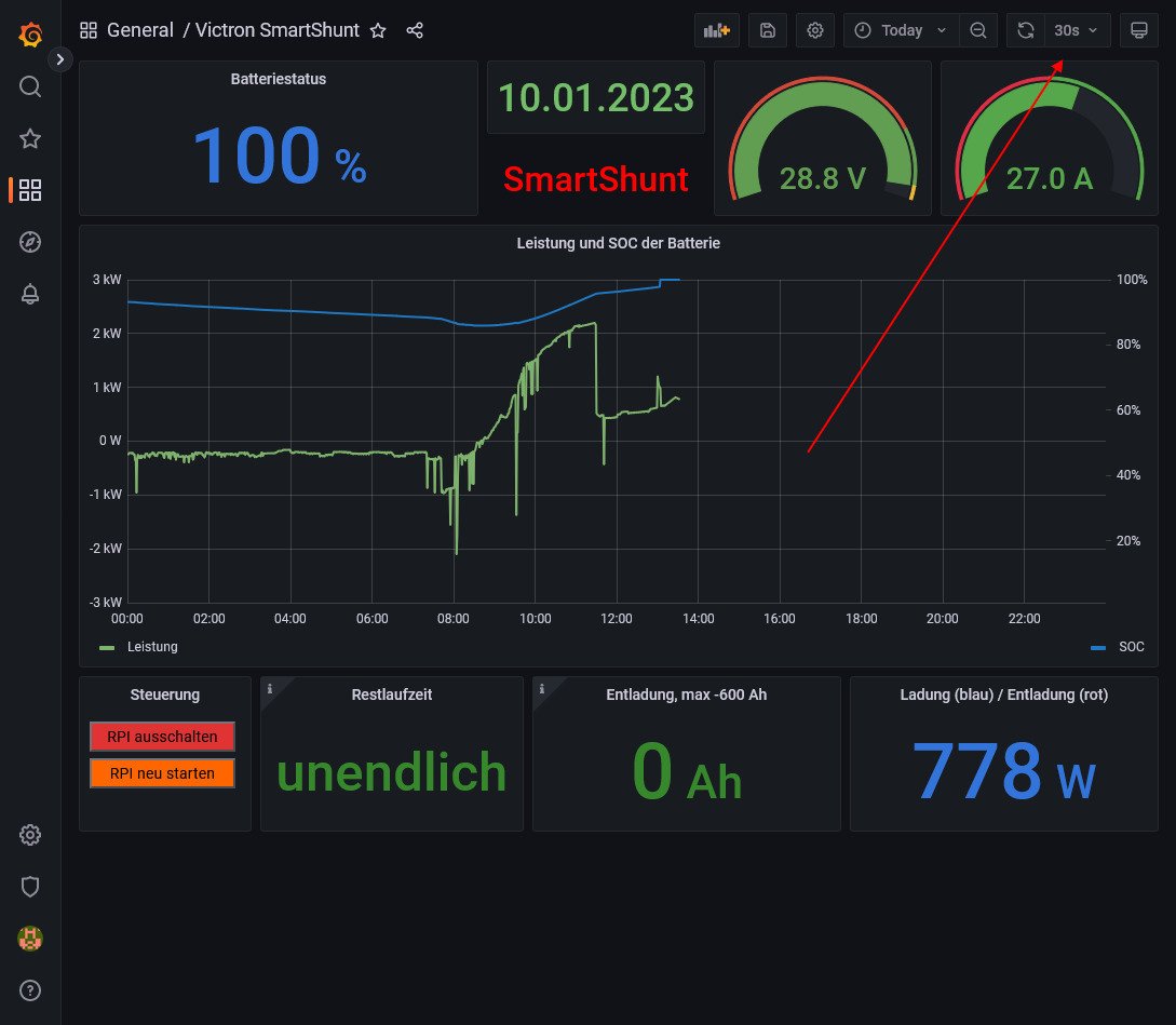 Hurra, Timo hat den entscheidenden Hinweis gegeben. In Grafana hatte ich schon den Zeitwert oben rechts im Dashboard auf 10s gestellt.