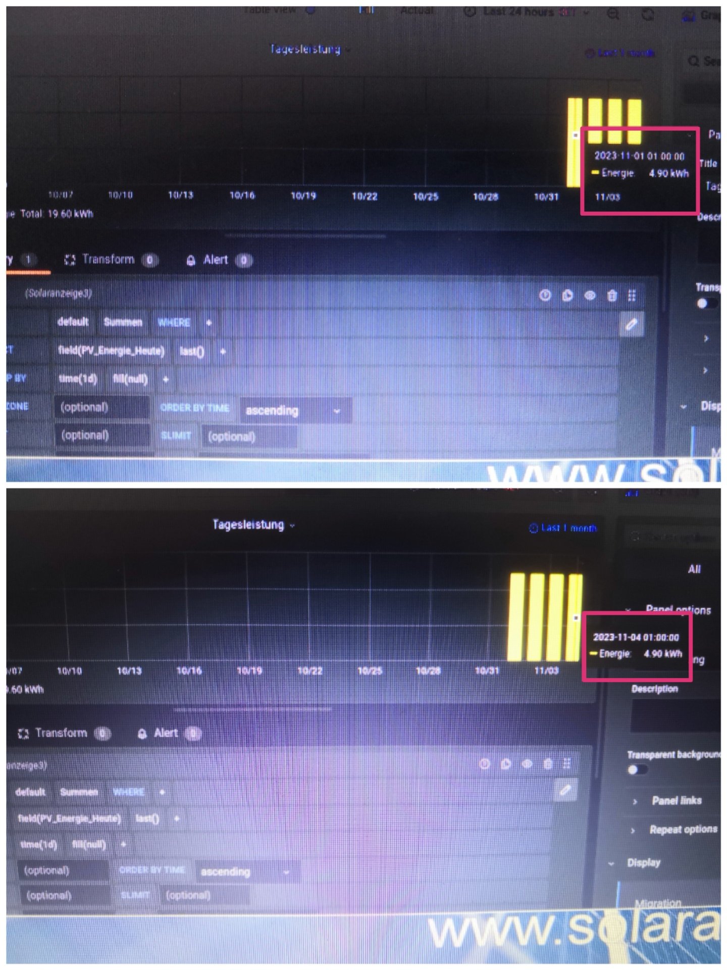 Die Tagessumme wird in der Nacht in der influx Datenbank gespeichert. Also sind alle Tage bis heute vorhanden. Deshalb ist es unnötig, die Tage im Monat noch einmal einzeln auszulesen. Man muss nur Grafana das richtig darstellen lassen.
