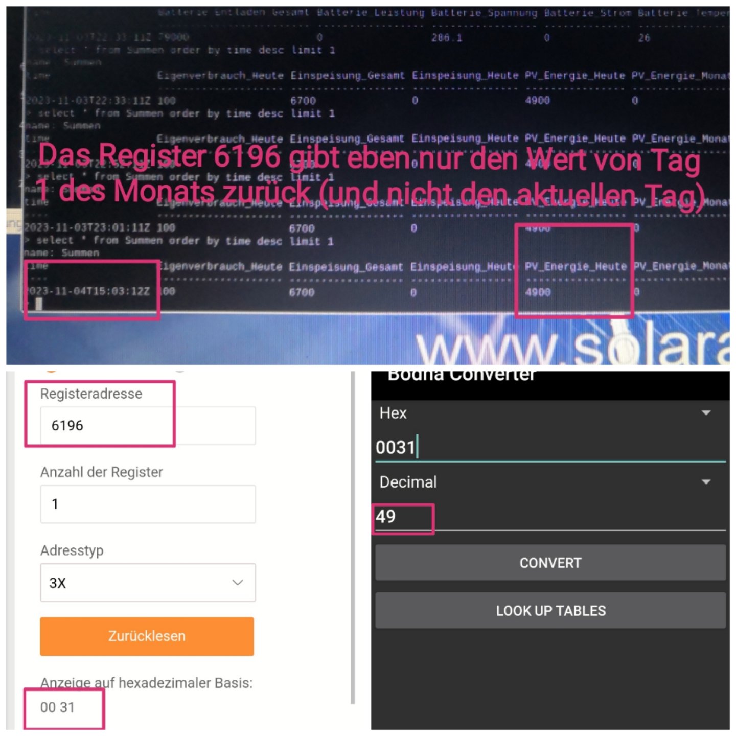 Mir ist dabei noch aufgefallen, dass "PV_Energie_Heute" auf bis zu 31 Register verteilt ist (6196 bis 6226).