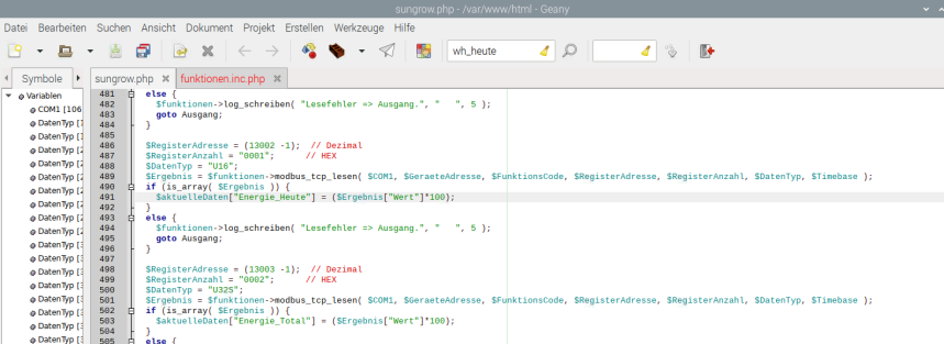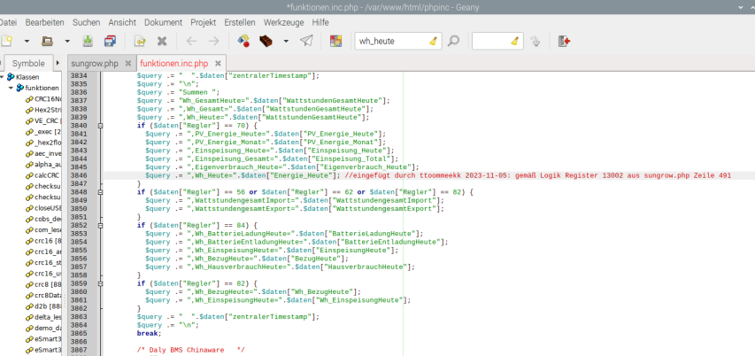 Habe gerade noch bei mir die "funktionen.inc.php" angepasst. Da fehlte noch eine Zeile mit dem Bezug zur sungrow.php, damit das Register 13002 auch korrekt in die influxDB (Measurement Summen; Spalte "WH_Heute") fließt (bislang waren die Werte der letzte 2 Spalten "Wh_GesamtHeute" & "Wh_Heute" gleich [vgl. hierzu mein Forenbeitrag in diesem Thread von gestern 17:59 Uhr]): Die angepasste funktionen.inc.php kann ich dir zusenden, falls du das für deine (zentrale) Version ändern möchtest.