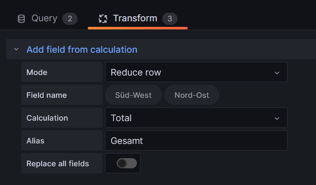 SELECT last("PV2_Leistung") AS "Nord-Ost" FROM "PV" WHERE $timeFilterLösung brachte, dass ich bei Transform folgendes eingetragen habe: Und nun sieht es aus, wie es soll: Ich glaube das war nicht ganz der Weg, der mir hier vorgeschlagen wurde - oder ich hab es falsch verstanden. Vielleicht hilft es ja dem einen oder anderen