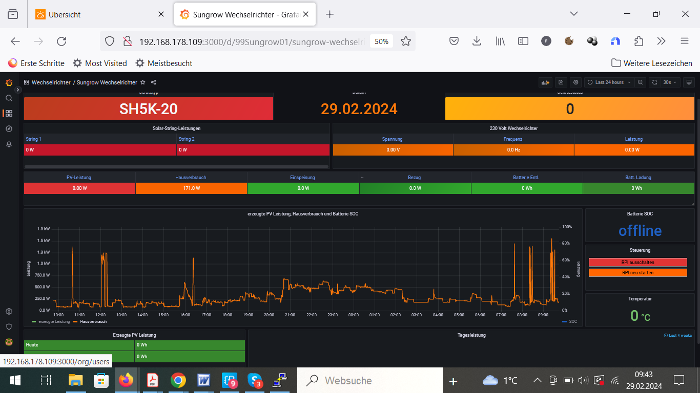 29.02. 22:25:02 -Sungrow: 192.168.178.45 Port: 502 GeräteID: 1