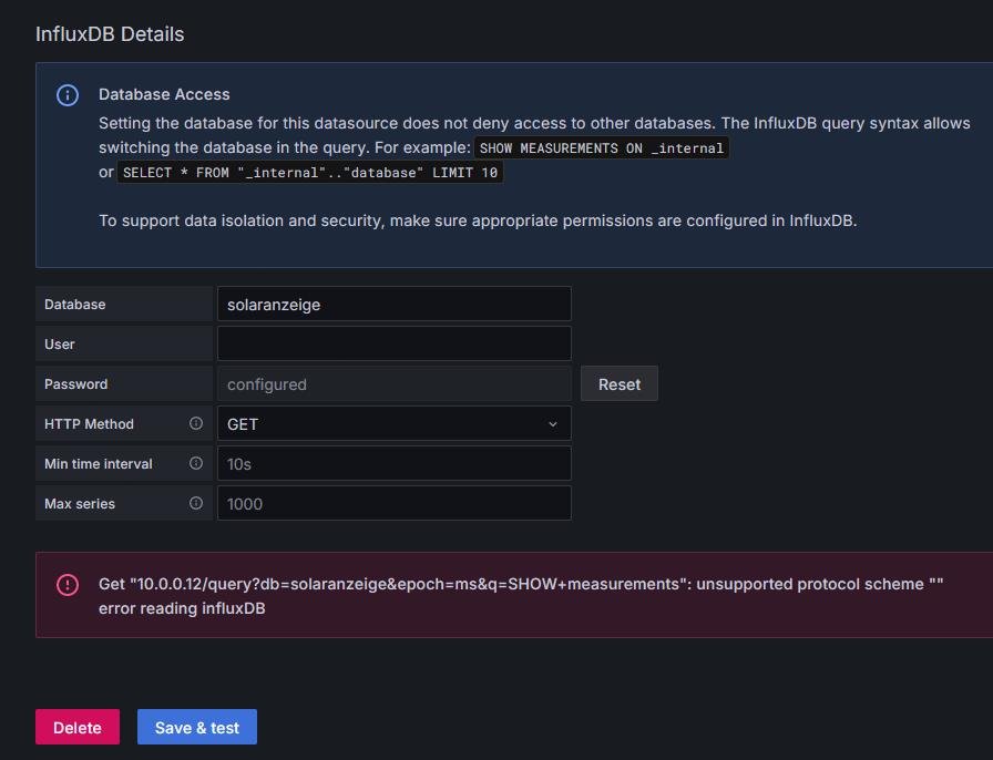 Die Daten in Grafana (IP-Adresse, Name der Influxdatenbank "solaranzeige") müssten stimmen, aber es kommt immer eine Fehlermeldung