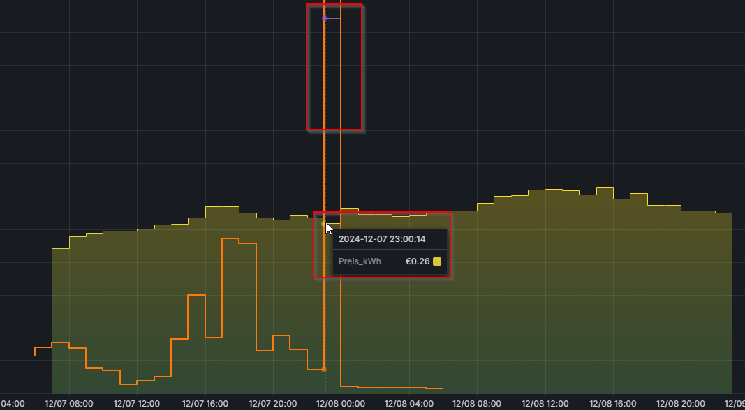 - System lädt irgendwann zwischen 23 und 24 Uhr da dort der Strompreis um 0,26 € lag