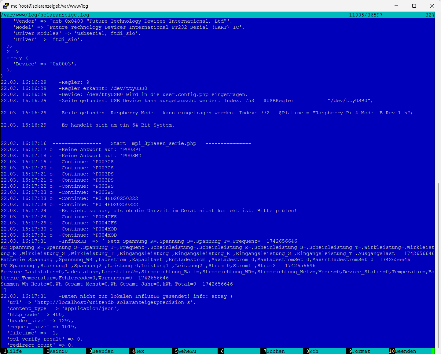 So, ich habe nun das serielle Kabel verwendet und es gibt immer noch keine Antwort vom MPI an Solaranzeige.Ulrich hat geschrieben: ↑Fr 21. Mär 2025, 08:22Der MPI hat doch auch zusätzlich noch einen seriellen Port. Es gibt Geräte, die geben die Daten nur über den seriellen Port heraus. Kannst du diesen bitte einmal benutzen und alle anderen Verbindungen zu Geräten entfernen. Dazu benötigst du einen Seriell zu USB Adapter mit FTDI Chipsatz.