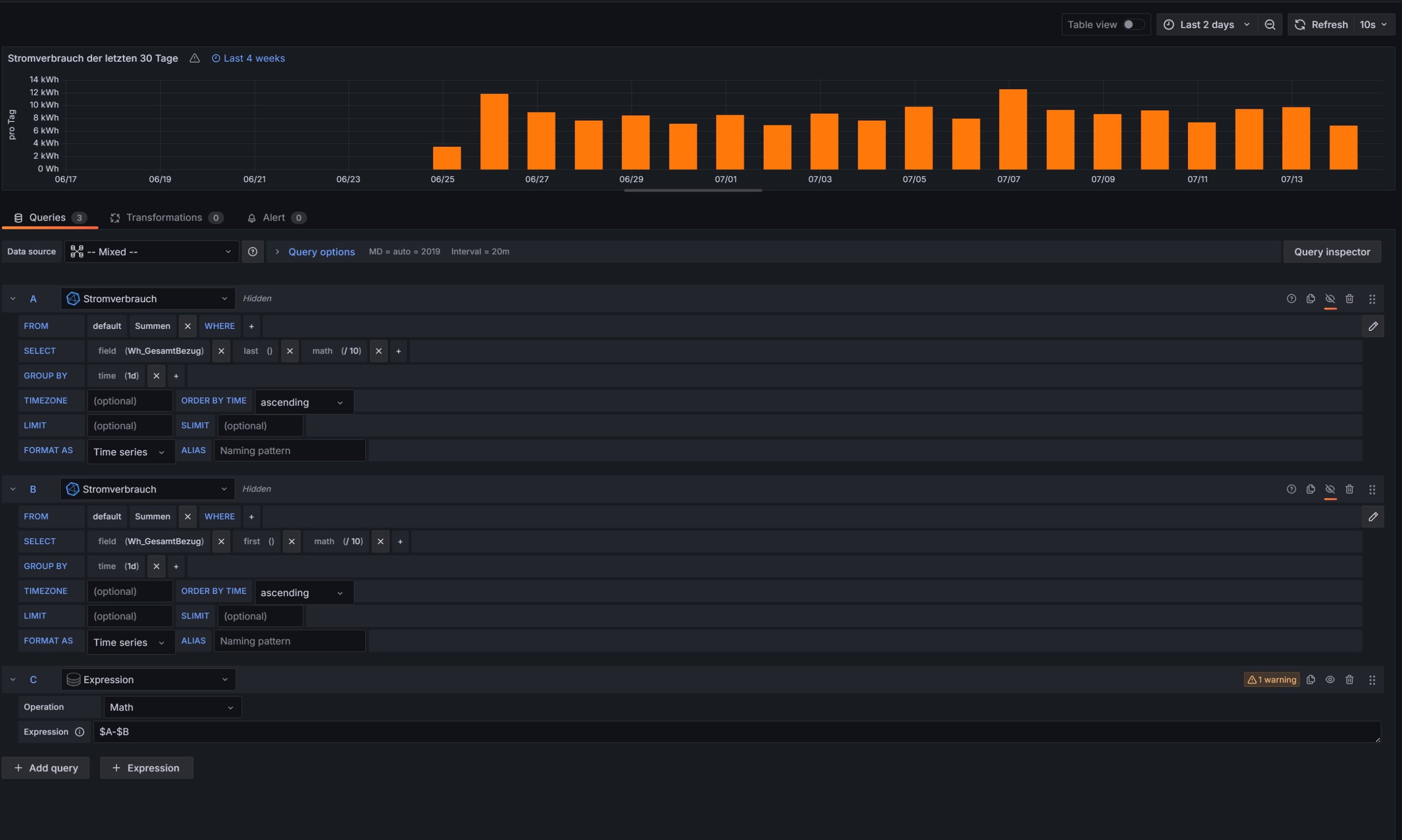 Ich habe die beiden Queries und die Expression vom Stromverbrauch einmal nachgebaut - alleine ohne die Queries der PV-Leistung - und berkomme die gleiche Fehlermeldung. Was für mich bedeutet - der Fehler dürfte hier zu finden sein....