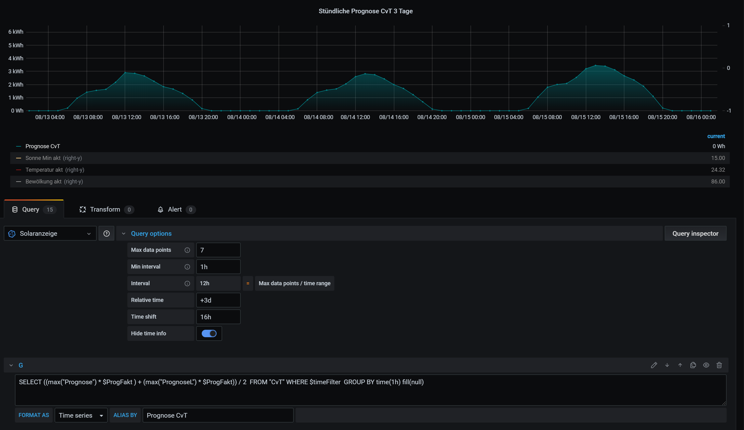 OK, auch wieder zum Teil meine Schuld. CvT ist mein Namenskürzel und ich habe meine Daten nicht unter dem Measurement "WetterPrognose" abgelegt, sondern unter meinem eigenen Measurement "CvT". Bei mir sind schon wieder mehr Daten vom DWD drin und ich habe die Prognose auch inzwischen mit einem Wärmefaktor versehen, da ich feststellen musste, dass die Leistung bei den aktuellen warmen Temperaturen deutlich nachlässt. Also berechne ich aus den angesagten Temperaturen pro Stunde einen Korrekturfaktor. Damit das nicht die Standardinstallation stört, mache ich mein eigenes Ding unter "CvT". Ich dachte das wäre nur ein Beispiel, wie die Berechnung aussehen könnte.