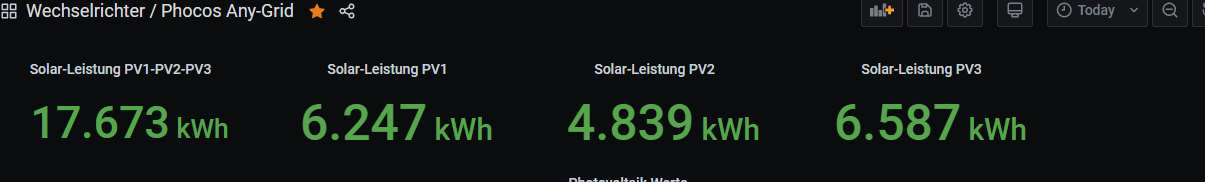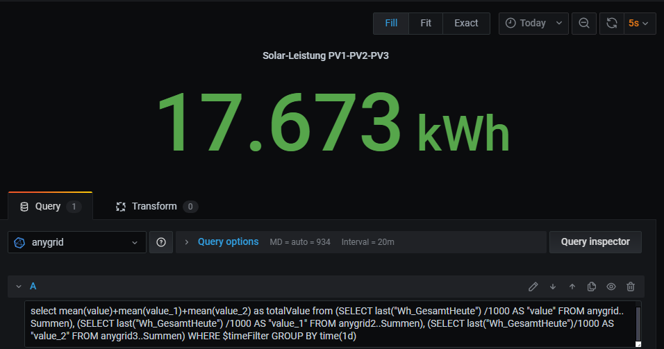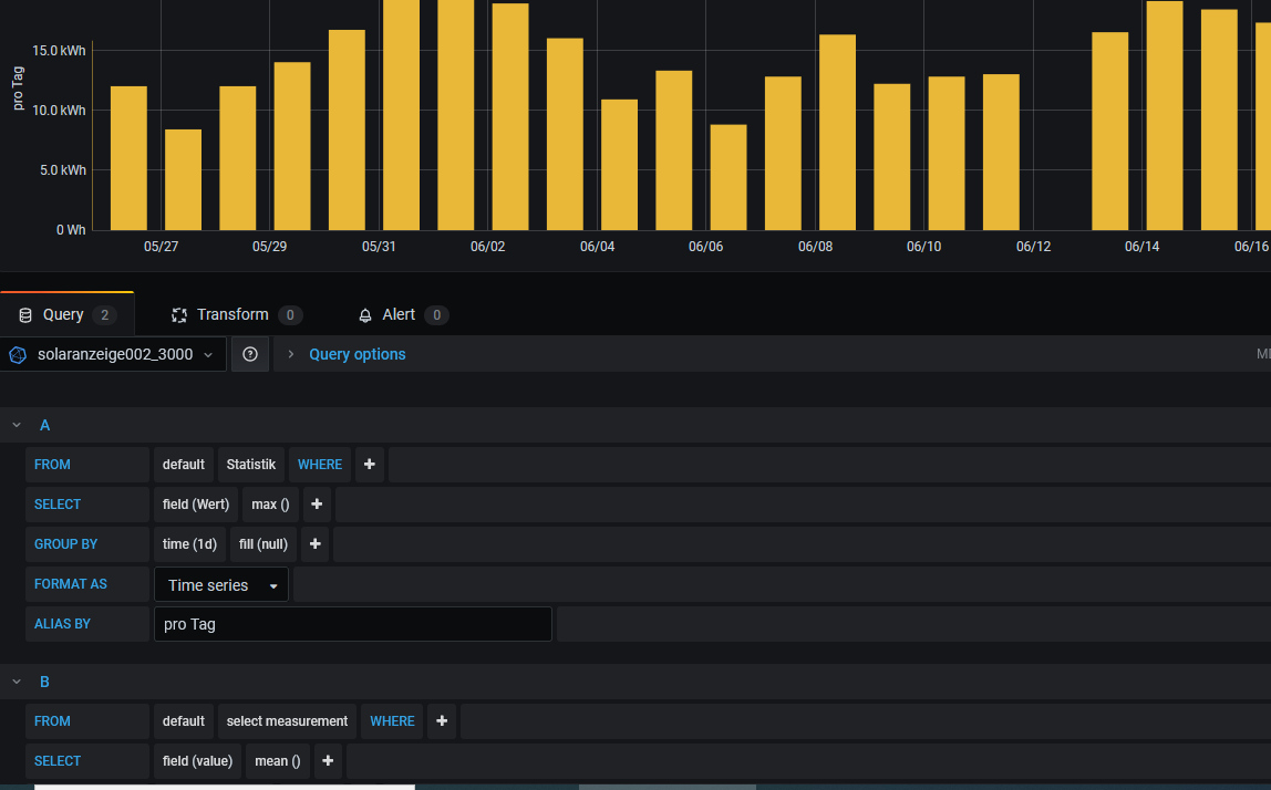 In Deinem Screenshot schaut es so aus als ob Du bei den Querys C (solaranzeige2) und A (solaranzeige1) Abfragen auf zwei verschiedene Datenbanken (solaranzeige 1 bzw 2) machst, stimmt das? Ich kann unterhalb des Graphen nur eine Datenbank auswählen (hier z.B. Solaranzeige002_3000) und dann dort auf verschiedene Measurements Bezug nehmen aber nicht auf verschiedene Datenbanken. Kannst Du meine Verwirrung aufklären? Danke, Dieter