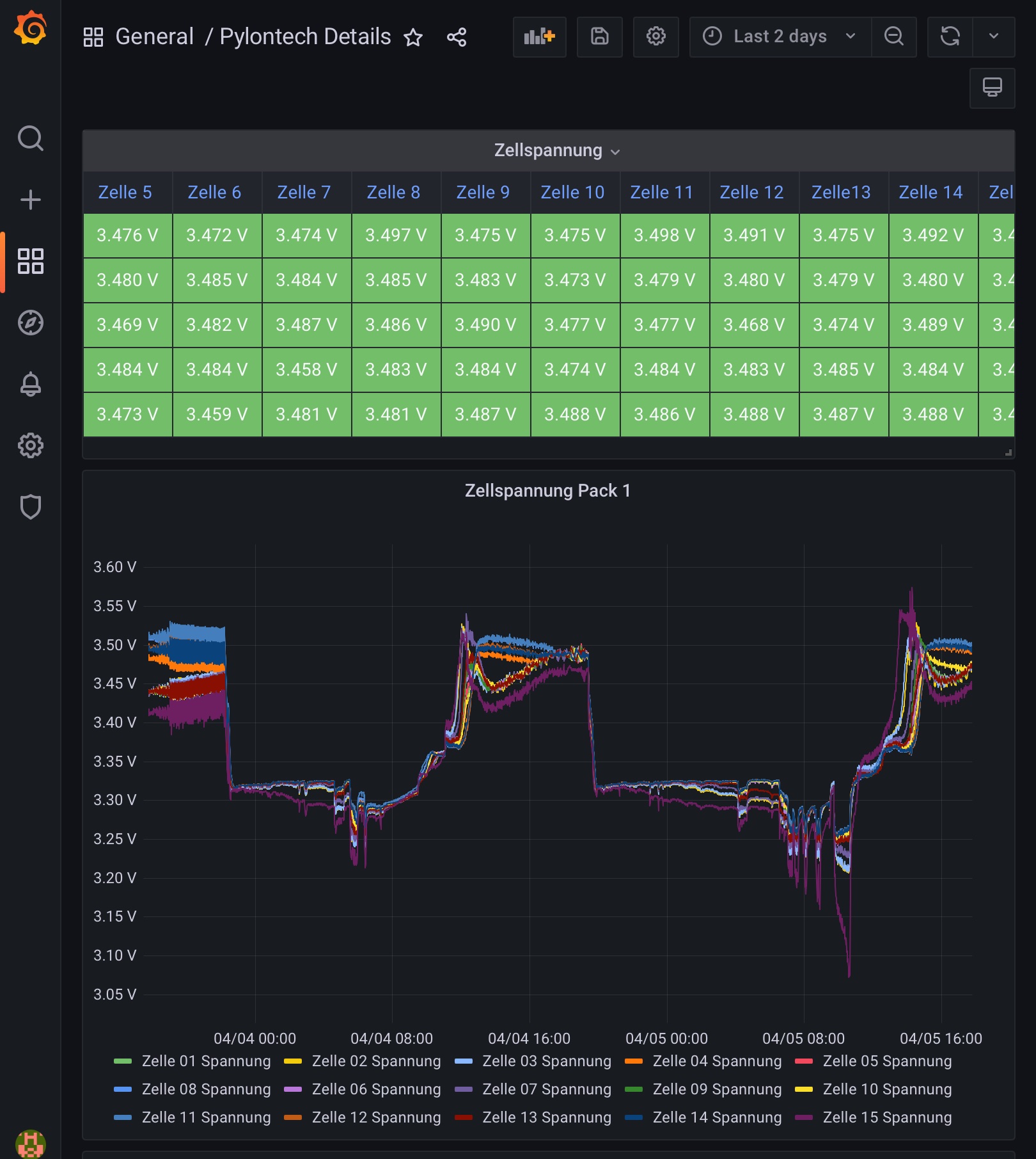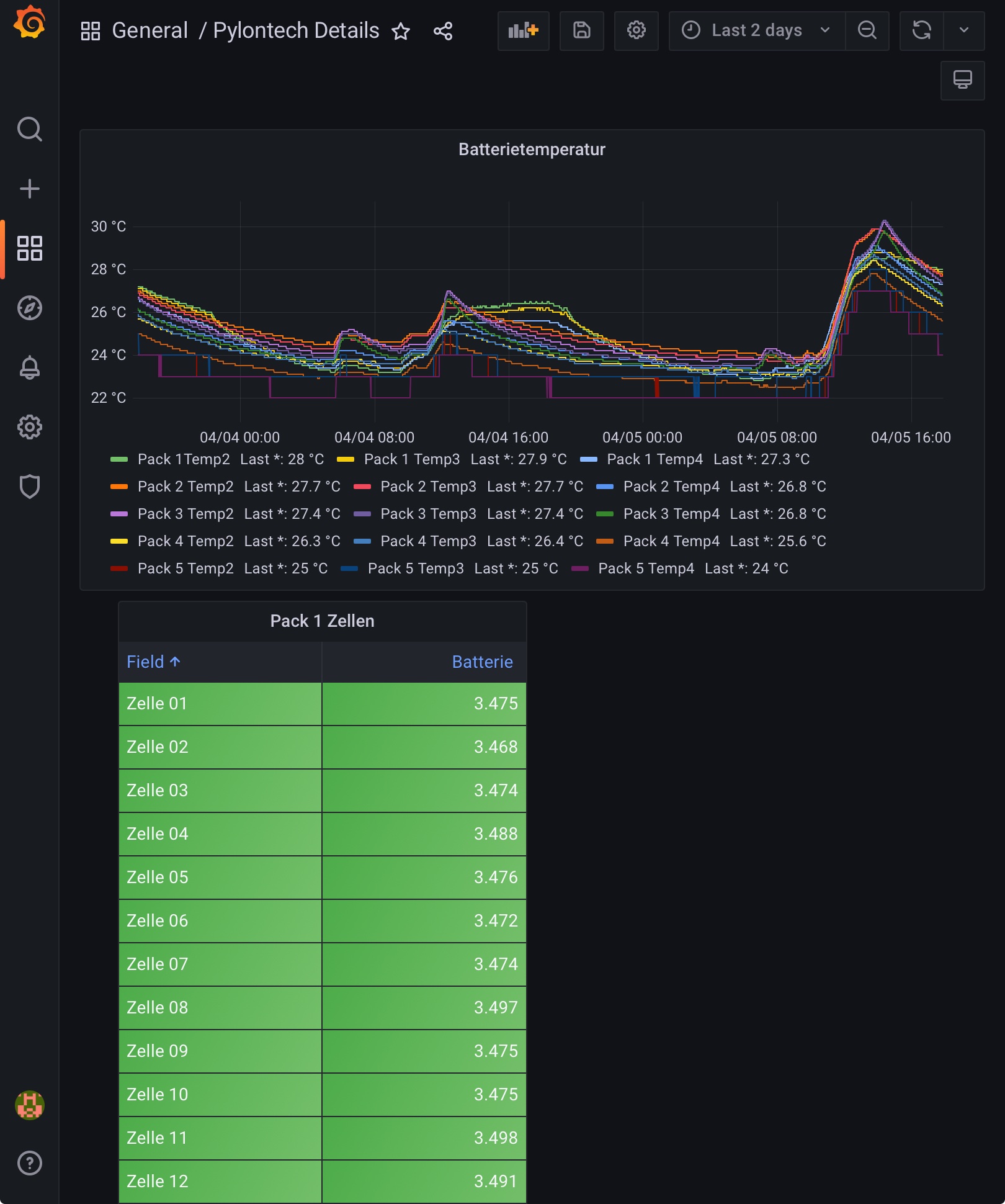 Ich habe mal ein Dashboard erstellt, bei dem man das Ballancing beobachten kann, falls es jemand braucht. Es ist für meine 5 Pylontechs.