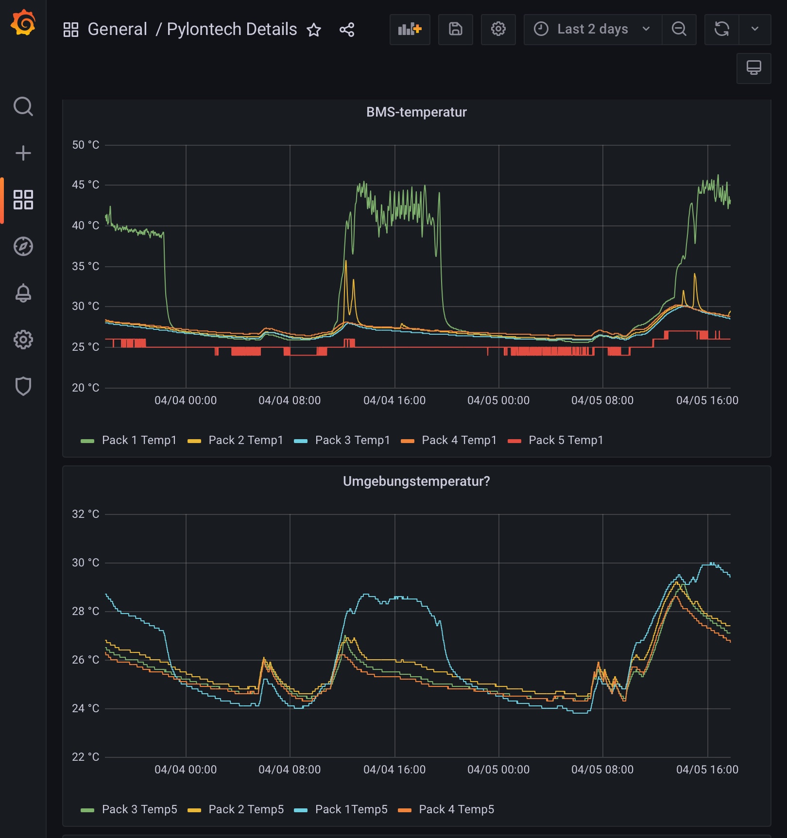 Hat mal jemand herausgefunden, was die Temperturen der Pylontechs sind? Es werden 5 Temperaturen bei meinen US2000C (Regler 41). Es sind aber wahrscheinlich nur 3 davon den Zellen zugeordnet. Eine gehört zum Ballancer(wahrscheinlich „PackX“; „Temp1“).