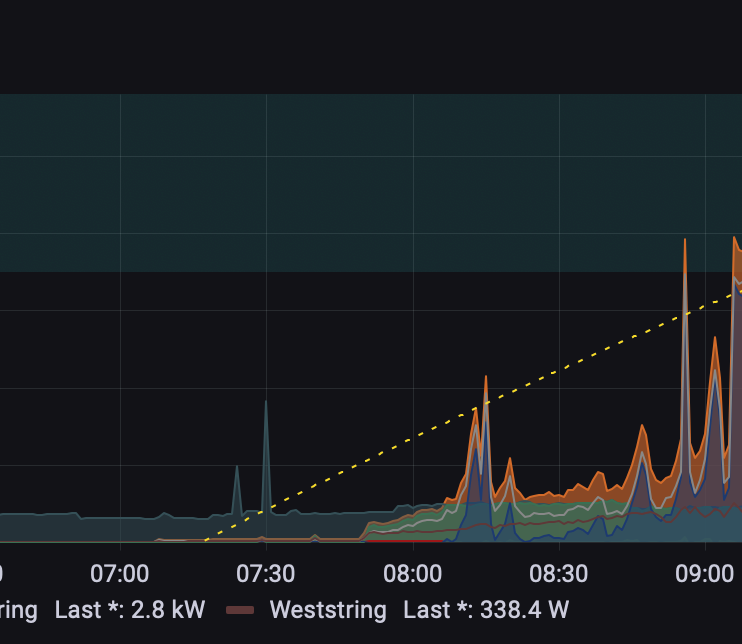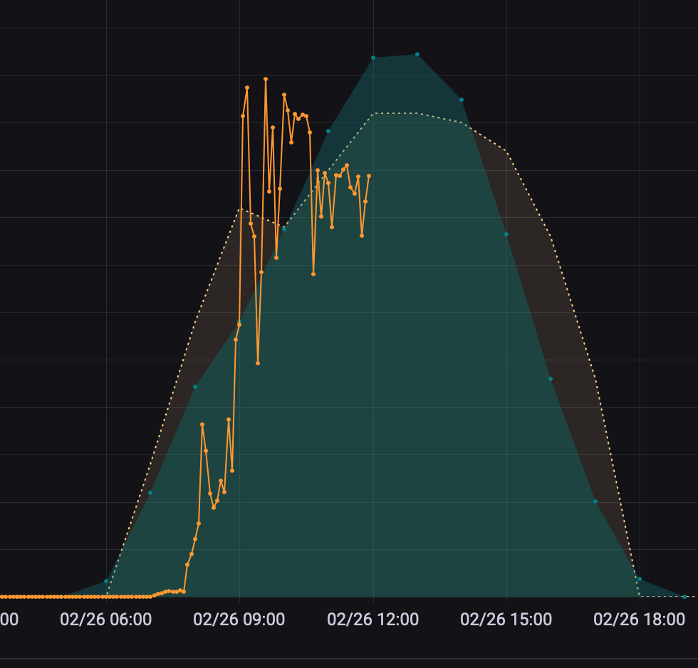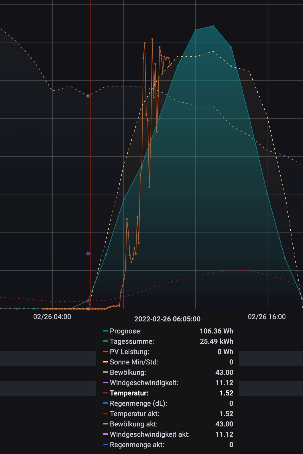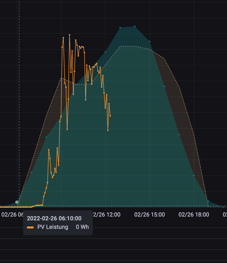 Nein der Wunsch ist nicht falsch, aber deckt sich nicht mit meinen Vorstellungen. Ich möchte stundenweise vergleichen, was die Prognose für die nächste Stunde ist und was dann tatsächlich erzeugt wurde. Du kannst es gerne mal ausprobieren, aber da passt es mit diesem Versatz von einer Stunde wesentlich besser. Natürlich kann es nicht zur "Live-Darstellung" passen, denn es gibt ja nur stündliche Werte. Das wirst Du dann sehen, wenn um 18:00 noch der Wert für die Stunde von 17:00 bis 18:00 angezeigt wird und Du dann sagst, ja um 18:00 ist die Sonne ja schon untergegangen. Richtig zur "Live"-Darstellung passt es nie, aber vielleicht besser wie vorher...