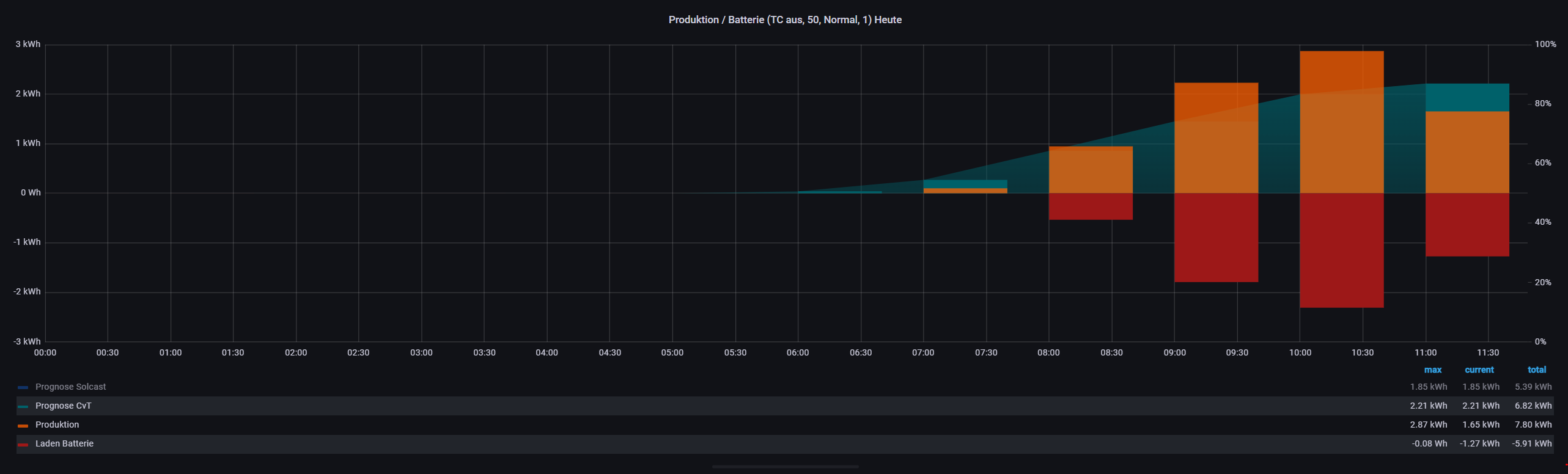 Hmm soweit alles korrekt. Ich musste jetzt erst mal selbst Testen (mit Deinen Werten). Es liegt wohl hauptsächlich am Wunsch, was dargestellt werden soll. Ich möchte in einer Grafik die zu erwartende Leistung für die "nächste" Stunde haben um sie der tatsächlichen Leistung (stundenweise) entgegen zu stellen. Daher habe ich z.B. um 7:00 den Wert für die Zeit von 7:00 bis 8:00 errechnet. Natürlich hat es um 7:00 nicht die errechnete Leistung, so dass in Deiner "Live"-Darstellung die Prognosekurve deutlich vorauseilt: