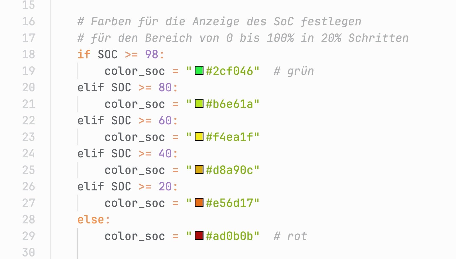 Wäre es möglich die Schriftfarbe des SOC Werts je nach Ladestand der Batterie in verschiedenen Farben zu zeigen ? z.B. unterhalb von 20% Ladestand in rot, zwischen 20 und 80% in hellgrün und darüber im bereits verwendeten dunkleren Grün ?