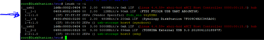 Schau mal bei mir sieht das so aus (wichtig verwende lsusb -c -i): In der markierten Zeile wird der geladenen Treiber und das zugeordnete USB Device (ttyUSB0) angezeigt.