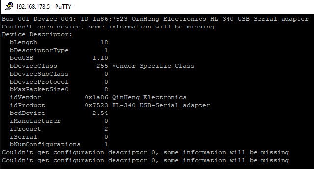 Er wird mir im Infocenter als "HL340 QunLing USB Serial Adapter" angezeigt, unter usbls oder dmesg finde ich aber nur unklare Infos...