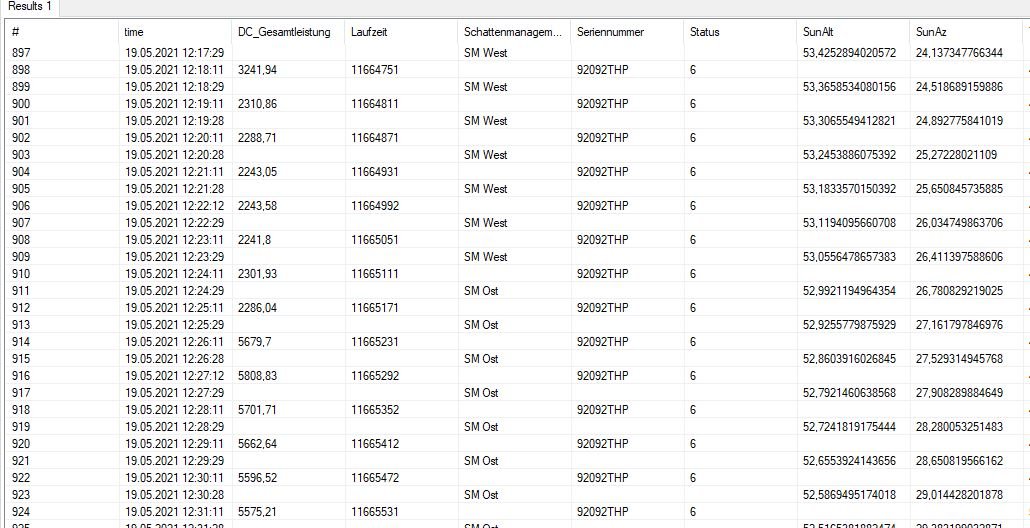 Es ist Vormittag (AZ < 0, also Sonne im Osten), die Sonne steigt über 32 Grad (ab da fällt erste Sonne auf Westdach und der Kamin wirft einen Schlagschatten bei mir auf Westdach), SM West wird eingeschaltet, also richtig (für mich). Bei mir passiert dies aber erst gegen 10 Uhr, bei Dir schon um 9 Uhr (Influx hat UTC Zeit, wir haben UTC +2)