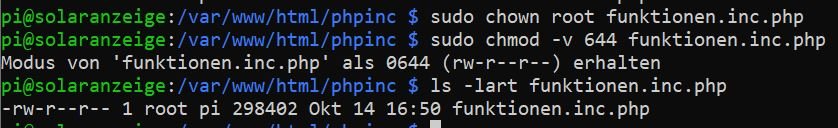 14.10. 21:26:09 |------------ Stop daly_bms.php ---------------------------- Ich habe die original Datei über SSH entfernt, dann die Angepasste Datei mittels SFTP vom Windows Rechner nach /var/www/html kopiert (da ich hier ausreichend Rechte besitze) und dann mit "sudo mv /var/www/html/funktionen.inc.php /var/www/html/phpinc/" wieder verschoben.