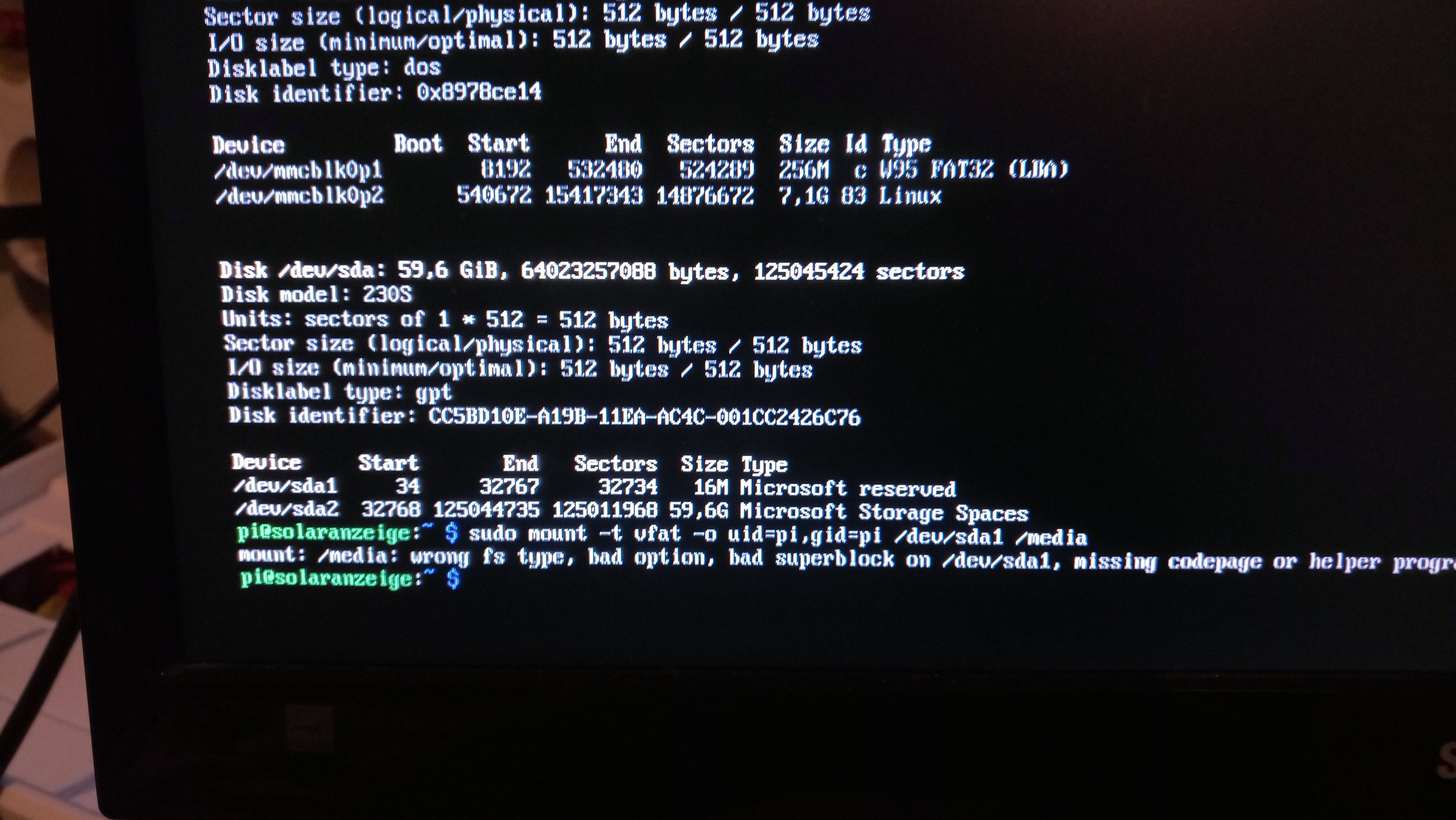 Ich habe das Gleiche bei mir gemacht und es funktioniert. Deine Fehlermeldung besagt, dass Linux das Filesystem der /dev/sda1 nicht kennt. Bei dem mount Befehl kann man auch das Filesystem mit angeben. ( Switch -t ) Im Internet sind genügend Beispiele, wie man das macht. Versuche es damit einmal.