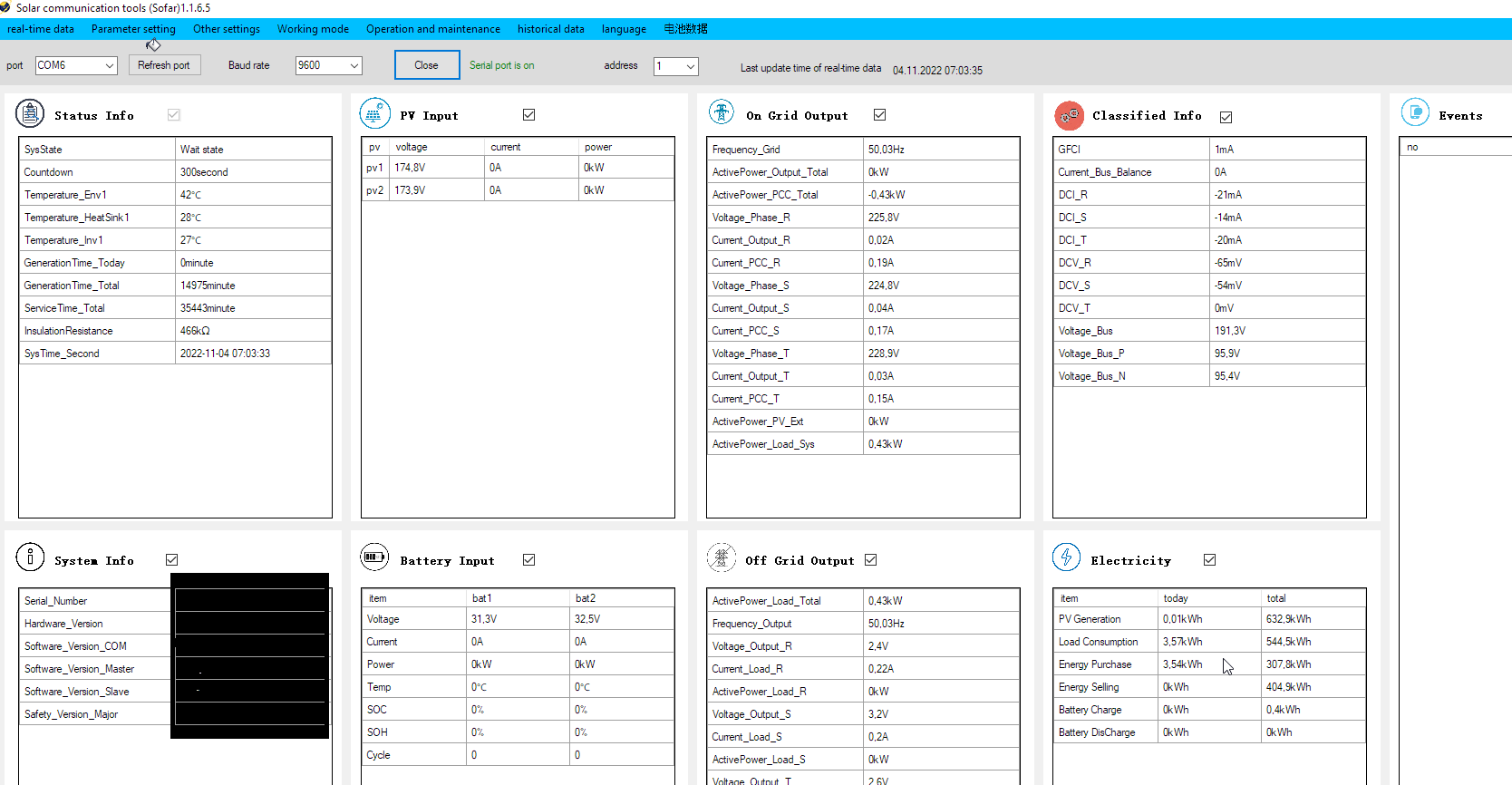 Ich habe bei Sofarsolar bzgl. einer Dokumentation für RS485 nachgefragt, aber leider haben die nichts dazu (sagen sie). Ich habe jedoch eine Software bekommen (SolarMonitor.exe). Ich werde diese mal ausprobieren und geb bescheid, ob damit die Kommunikation funktioniert.