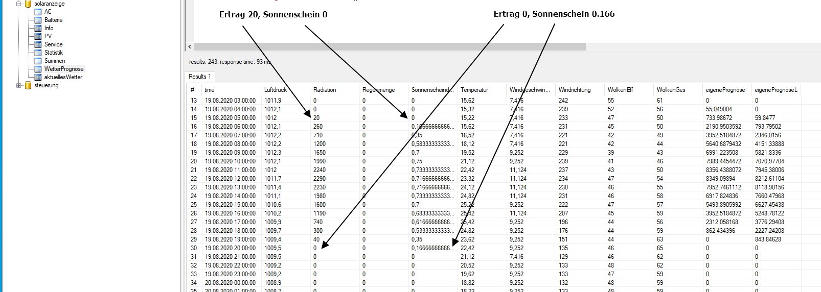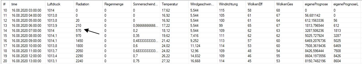 Welchen Wert vergleichst du? Rad1h wird mit dem gleichen Zeitstempel wie eigenePrognose gespeichert, eigenePrognoseL mit dem anderen Versatz. eigenePrognoseL ist mit einem Versatz von z.B. 3h dann natürlich noch der höhere Wert mit der Radiation der Stunde zuvor. (Du hast geschrieben Du möchtest den Versatz lieber 1 Stunde mehr als 1 Stunde weniger machen).