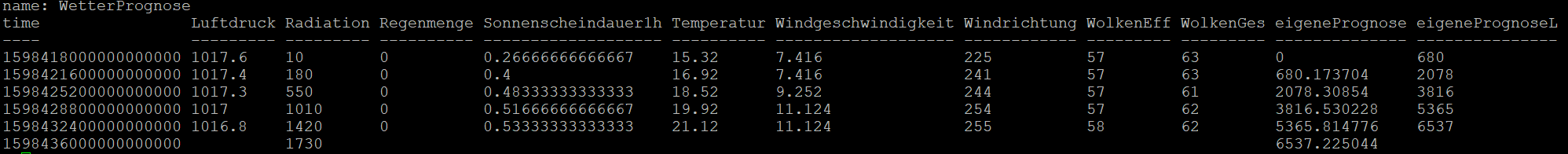 Dieses Ergebnis (2153,8834) würde ich jetzt in den Spalten "eigenePrognose" und "eigenePrognose" erwarten, erst einmal egal ob zur vorhergehenden, der aktuellen oder der folgenden Stunde. Solange ich die 2153 in der Prognose nicht erreiche, muss noch irgendwo anders eine Beeinflussung vorliegen.