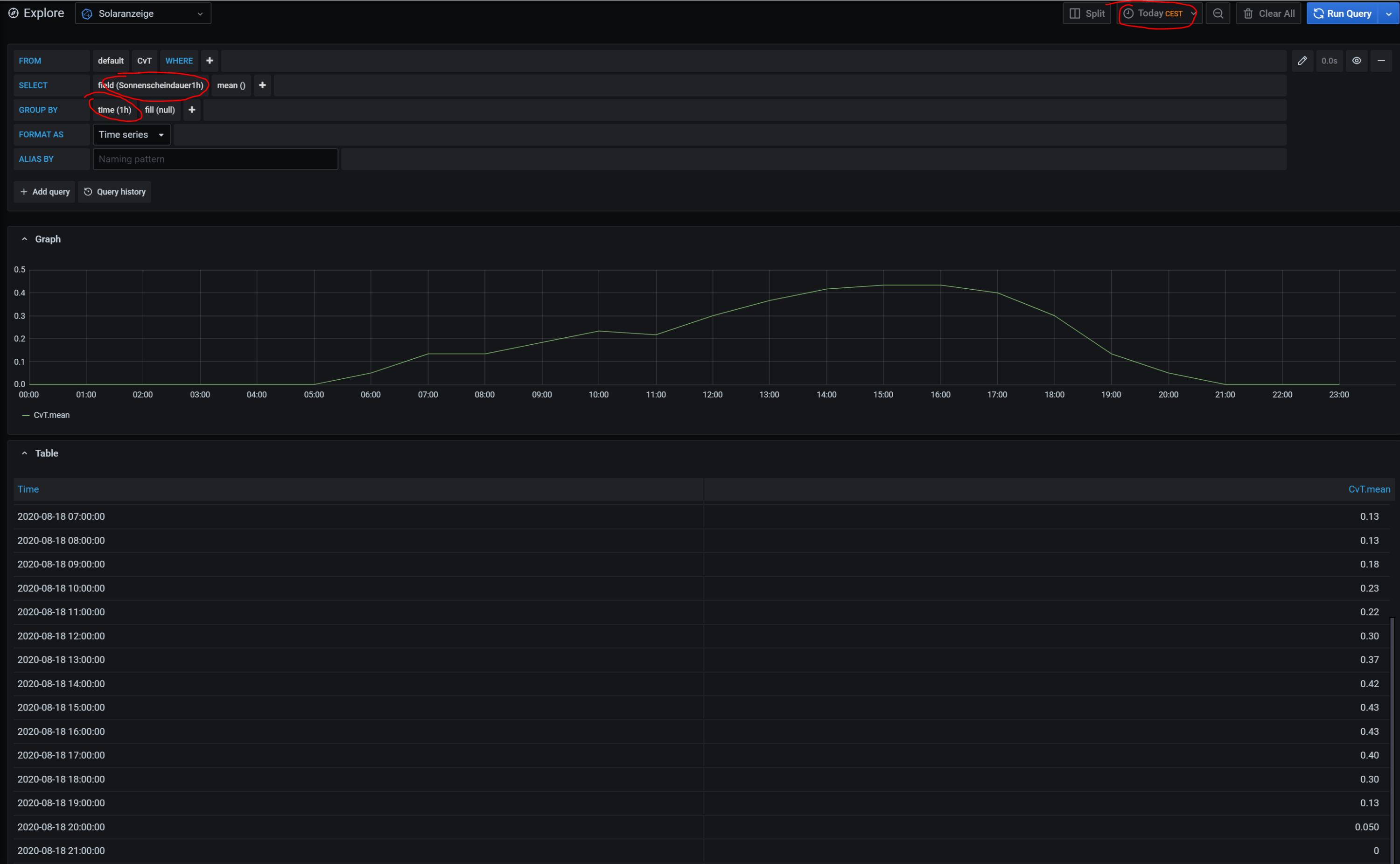 SELECT sum("Sonnenscheindauer1h") * 60 FROM "CvT" WHERE $timeFilter GROUP BY time(1h) fill(null)Re: Ertragsprognosedaten in Solaranzeige einbinden