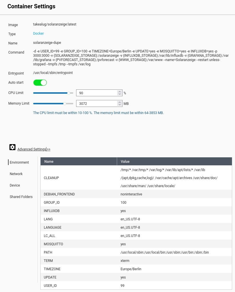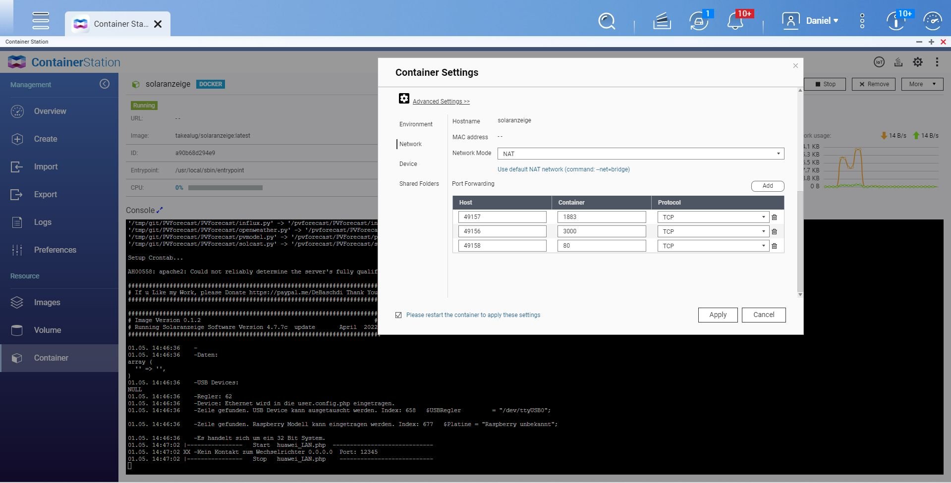 Solaranzeige im Docker-Container in QNAP-Container-Station