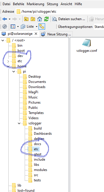 Hallo Dieter, das sind eine Menge Fragen bzw. Sachen die hier zu klären sind. Zunächst mal vorab: es ist nicht korrekt, dass du mit mehreren etc Ordnern zu tun hast. Normalerweise liegen die Konfigurationsdateien in dem Ordner /etc, also der in deinem Screenshot oben abgebildet ist. Dort sucht vzlogger auch nach der vzlogger.conf, lege dort zum Test einfach mal eine vzlogger.conf an in der du die Logausgaben auf 15 stellst und lasse dir nach dem Start von vzlogger mal das Log anzeigen (z.B. mit "tail -f /var/log/vzlogger.log")
