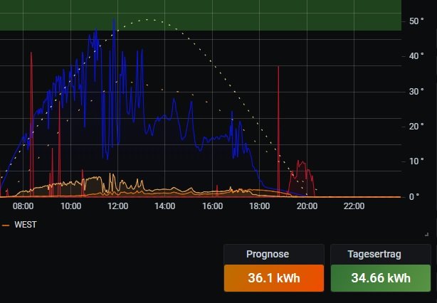 Bei der Solarprognose an sich ist die Tendenz richtig, die besten Vorhersagewerte treffen bei blauem Himmel ein, aber die Kurve dazu passt selten. Meine Daten sind aufs halbe Grad genau ermittelt, entweder haben die PV Module bei mir ne Plus Toleranz von über 10% oder ich hab zu hohe Erwartungshaltung an die Daten :) Bei mir sieht das an einem wolkenlosen Tag so aus, dass der Ertrag der Prognosekurve vorauseilt,ca 1-1,5h
