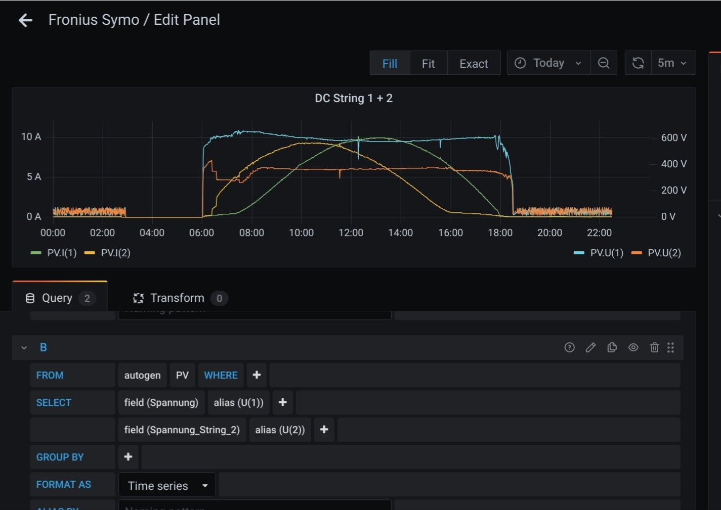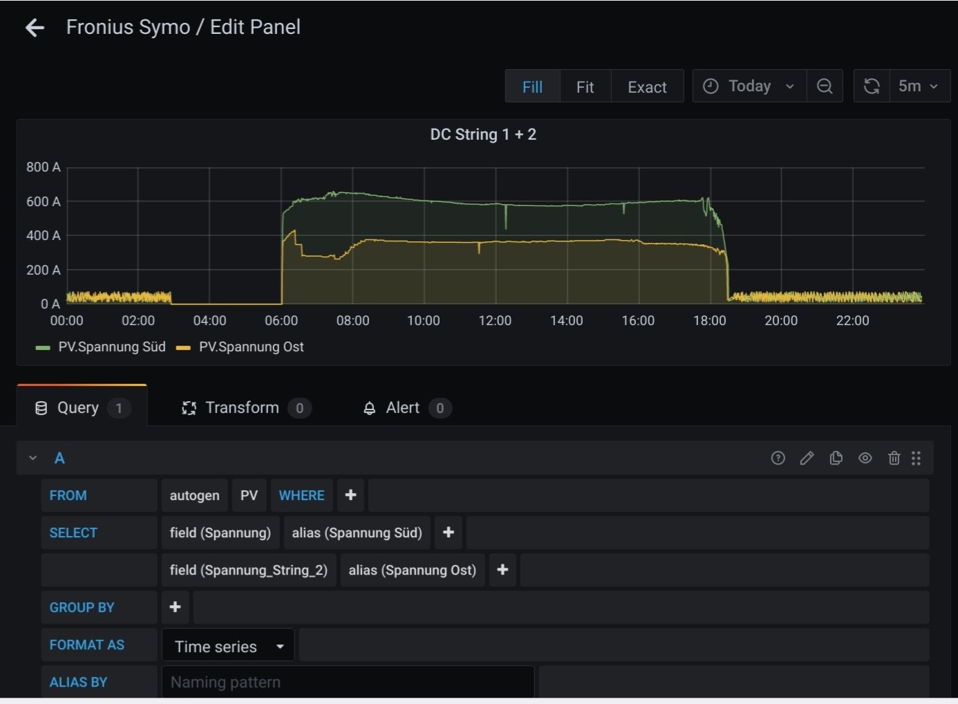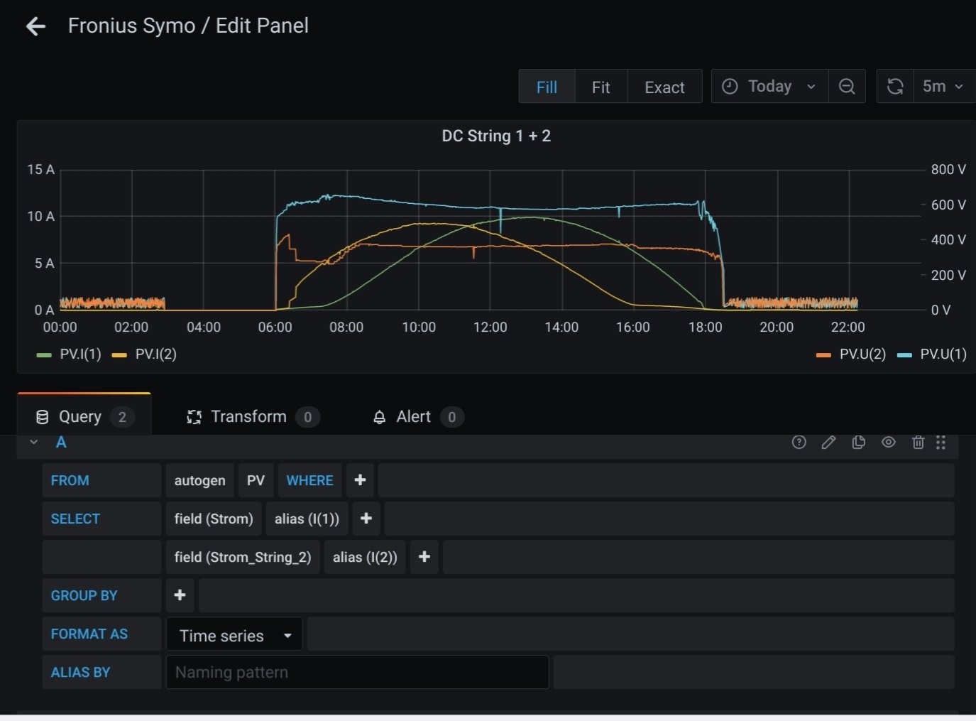 Die Grafik DC String 1+2 zeigt im Original 2 Werte für Spannung und 2 Werte für Strom überlagert an. Sobald du die Texte nach dem Befehl "alias" änderst, kann Grafana nicht mehr alle Werte gleichzeitig anzeigen und blendet bei mir die 2 Werte für Strom aus.