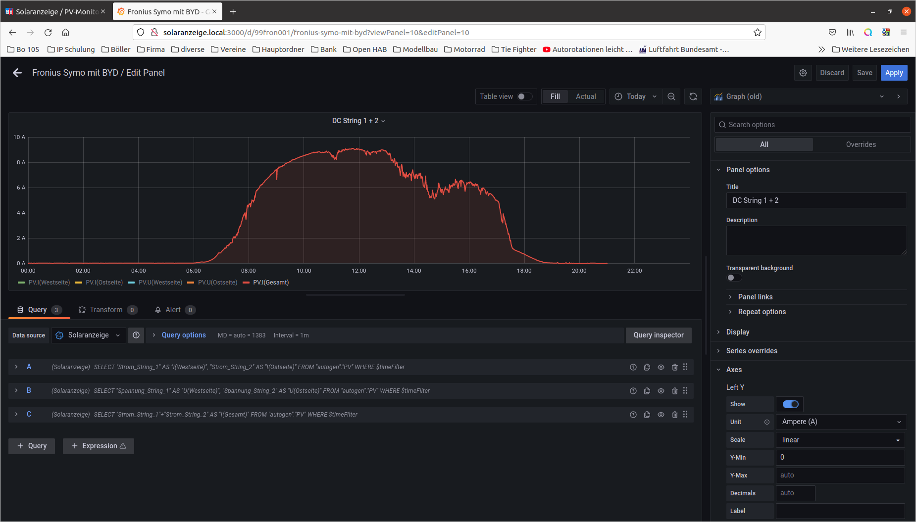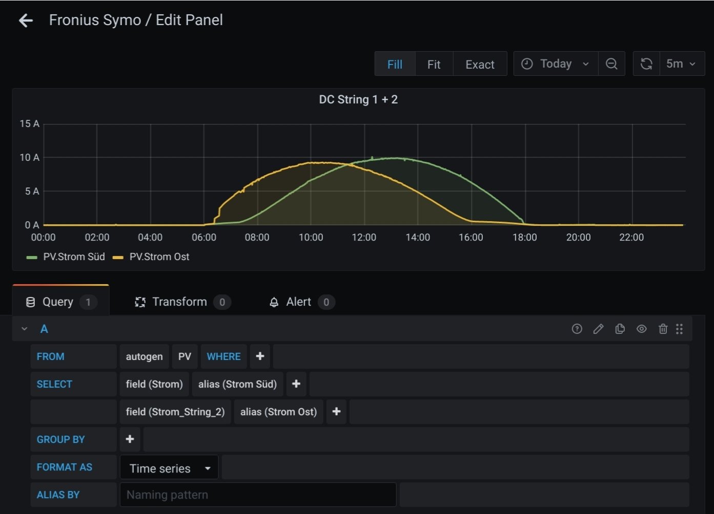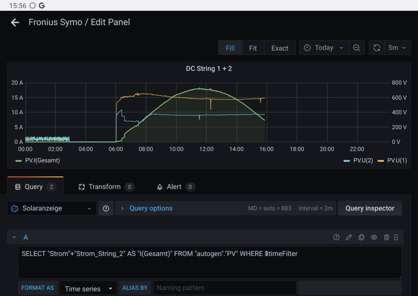 Die Grafik DC String 1+2 zeigt im Original 2 Werte für Spannung und 2 Werte für Strom überlagert an. Sobald du die Texte nach dem Befehl "alias" änderst, kann Grafana nicht mehr alle Werte gleichzeitig anzeigen und blendet bei mir die 2 Werte für Strom aus.