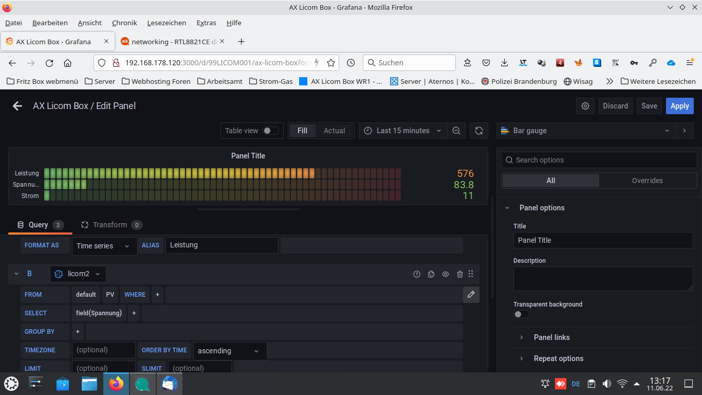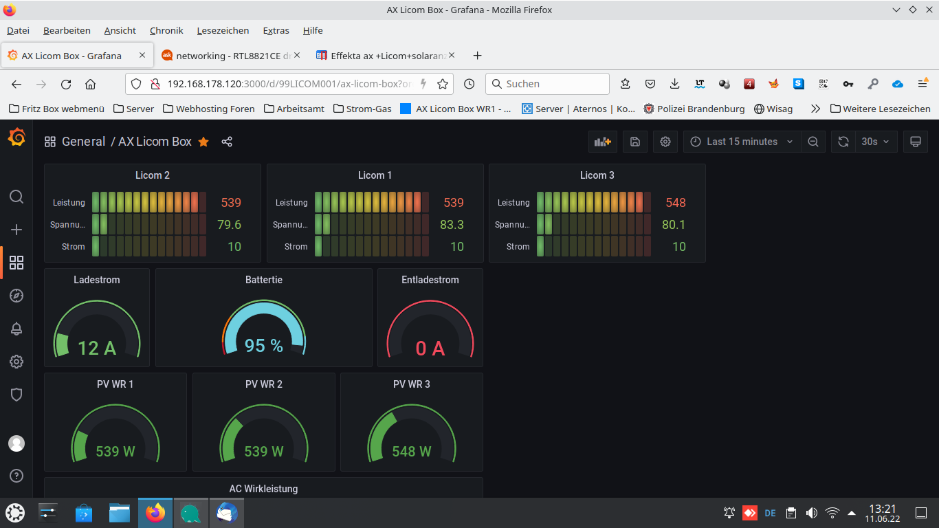 Hallo Ulrich, ich habe mir das alles nun eine Weile angesehen und auch selber mal ein Panel gebaut mit Kreisdiagrammen. Ich stelle aber fest, das bei allen (deine für Licom 1-3) und auch meinem selbstgebauten die Werte für PV Leisung nicht stimmen. WR1 passt also Licom 1 das haut hin aber 2 und 3 nicht, ist viel zu hoch. Ich bekomme da Werte von 1,5KW, das schaffen die Platten zwar rechnerisch, aber am WR im direkten Vergleich stehen nur 1,1kw bis 1,2 kw.