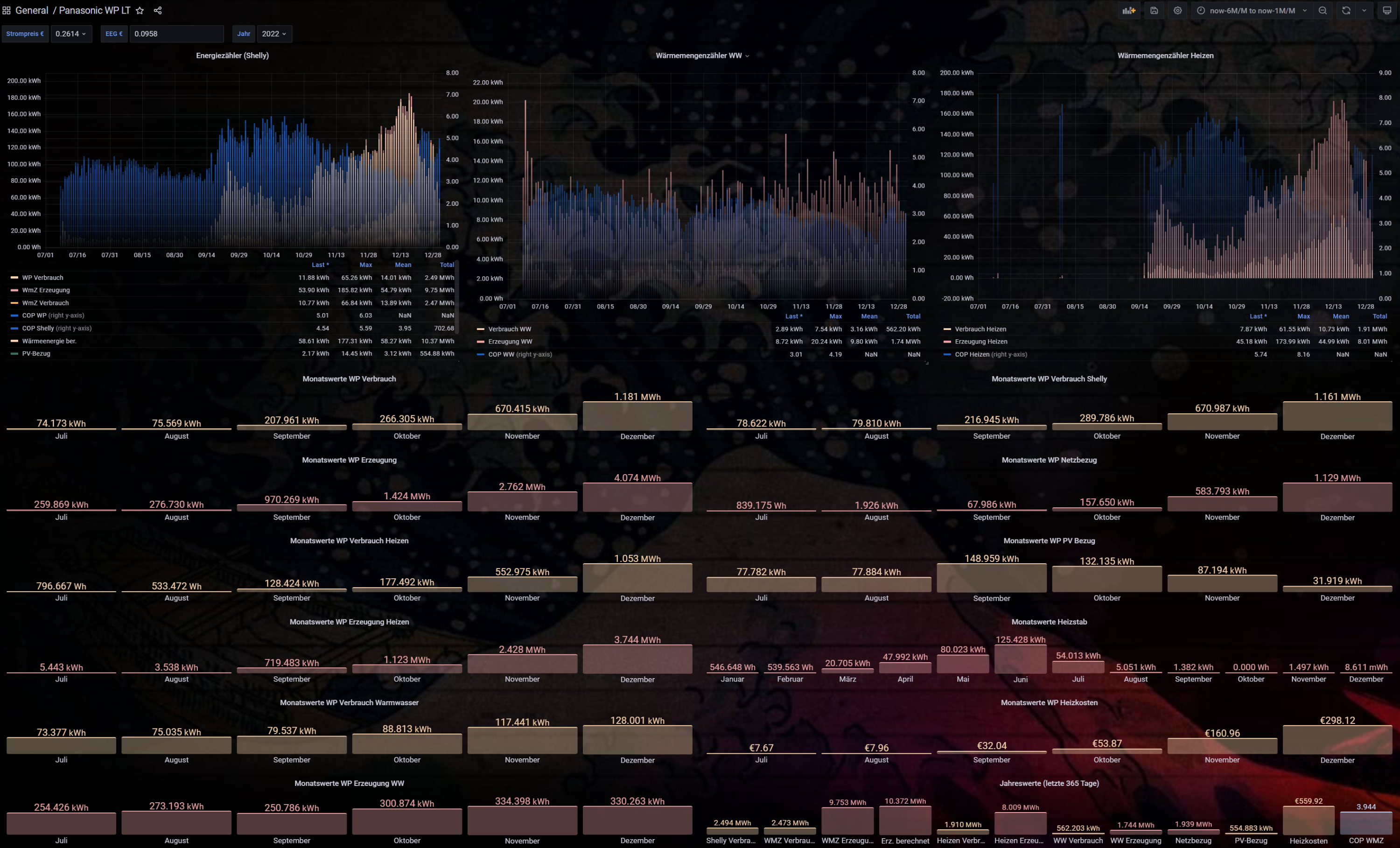 Grafana kann leider keine monatlichen Summierungen und hier musste ein Trick her. Ich habe dazu in den Statistikdaten von Solaranzeige Korr1 bis Korr12 eingetragen, mit diesen kann ich ausgehend vom aktuellen Monat immer korrekt die letzten 12 Monate anzeigen. Wenn es also gerade Juli 23 wäre, dann würde er von August 22 bis Juli 23 anzeigen. Immer automatisch. Daher aktuell auch die Anzeige von Januar(23) bis Dezember(22), WP kam erst im Juli, daher sind die Monate ohne Werte automatisch ausgeblendet.