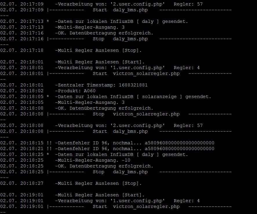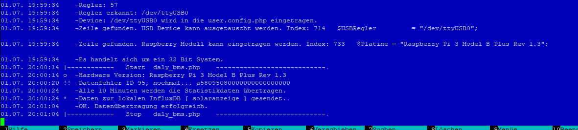 Habe drei WR (Steca Solarix) und alles funktioniert prächtig. Nun wollte ich noch ein nagelneues Daly-Smart-BMS (LiFePo, 48V, 16S) einbinden und es werden bei der Einrichtung gemäß Anleitung auch Daten ausgelesen, jedoch nicht zur InfluxDB gesendet was evtl. ja an den fehlenden Werten ab Spannung_Zelle10 liegen könnte: