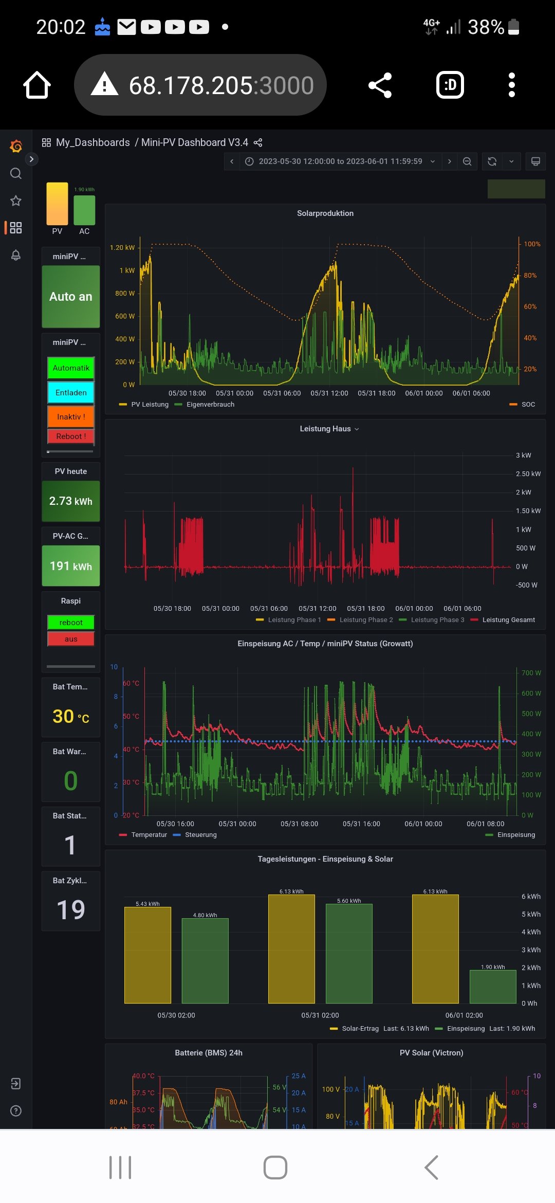 Läuft in den Piloten soweit gut, wie öfters bereits geschrieben, muss es demnächst mal in den Standard Code überführt werden, Problem ist, dass es natürlich immer wieder Solaranzeige Updates gibt und das mal in einen Zeitpunkt mit allen Anpassungen als Steuerung hinzugefügt werden muss.