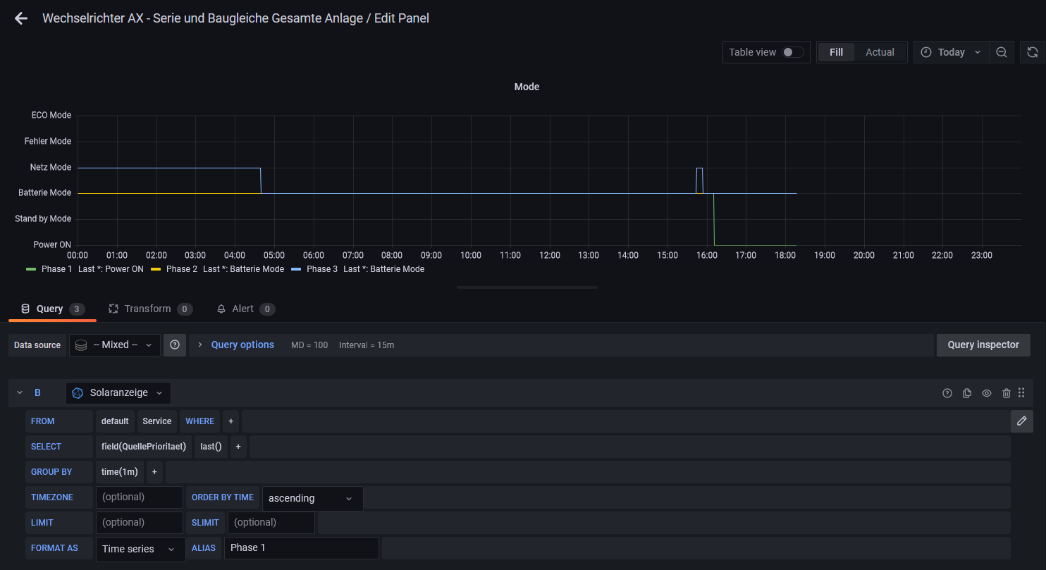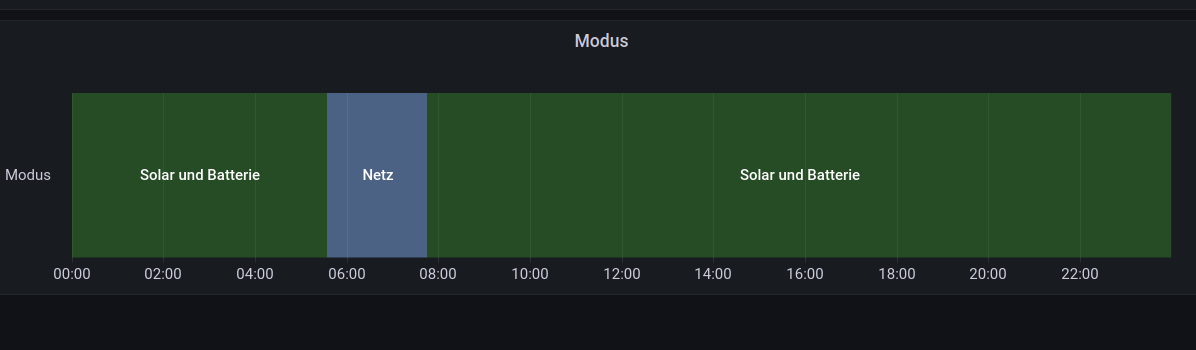 hatte auch schon eine Lösung gefunden. So langsam finde ich mich im Grafana zurecht und finde auch die Daten in der Datenbank. Nur muss ich noch rauskriegen, nichts anzuzeigen, wenn noch keine Daten vorliegen. Das Bild zeigt deas Ergebis von heute 8:50 Uhr.
