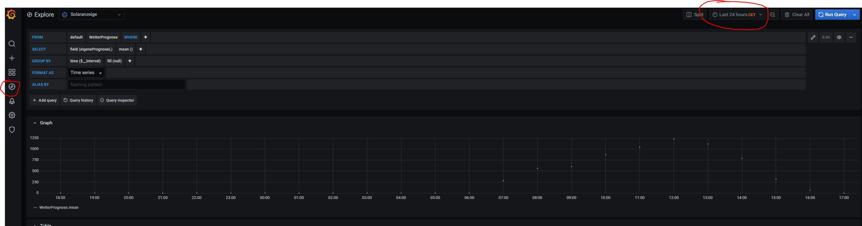 Zur Abfrage von Werten kann auch Grafana genutzt werden. Unter "Explore" (linke Navigation, siehe Screenshot) kann eine oder mehrere Queries erstellt werden und als Tabelle oder Grafik angezeigt werden...