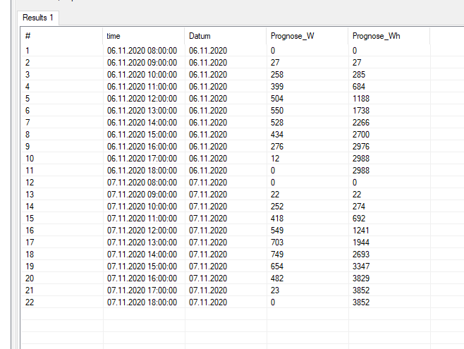 Dein Screenshot zeigt die Ausgabe von der prognose_TEST.py, Du musst aber schon die prognose_TEST.php aufrufen um Daten in die Datenbank zu schreiben. Also die PHP ist als zeitgesteuerter Aufruf in die Crontab eingetragen?