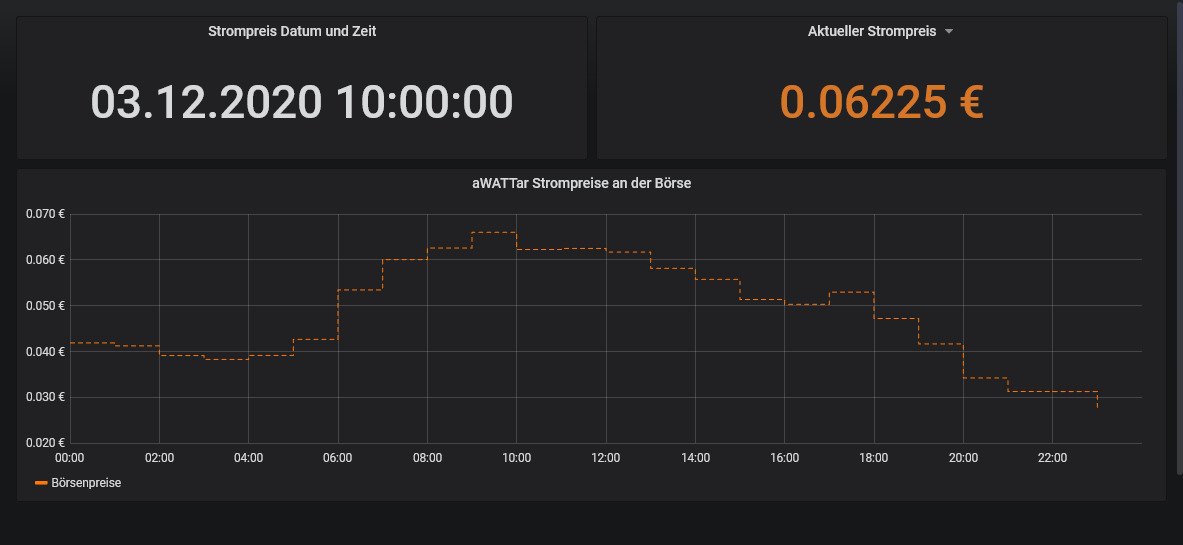 Es ist angedacht, die Preise von aWATTar in die Influx Datenbank zu übernehmen, um sie anzeigen zu können und später in der Wallbox Steuerung zu nutzen.