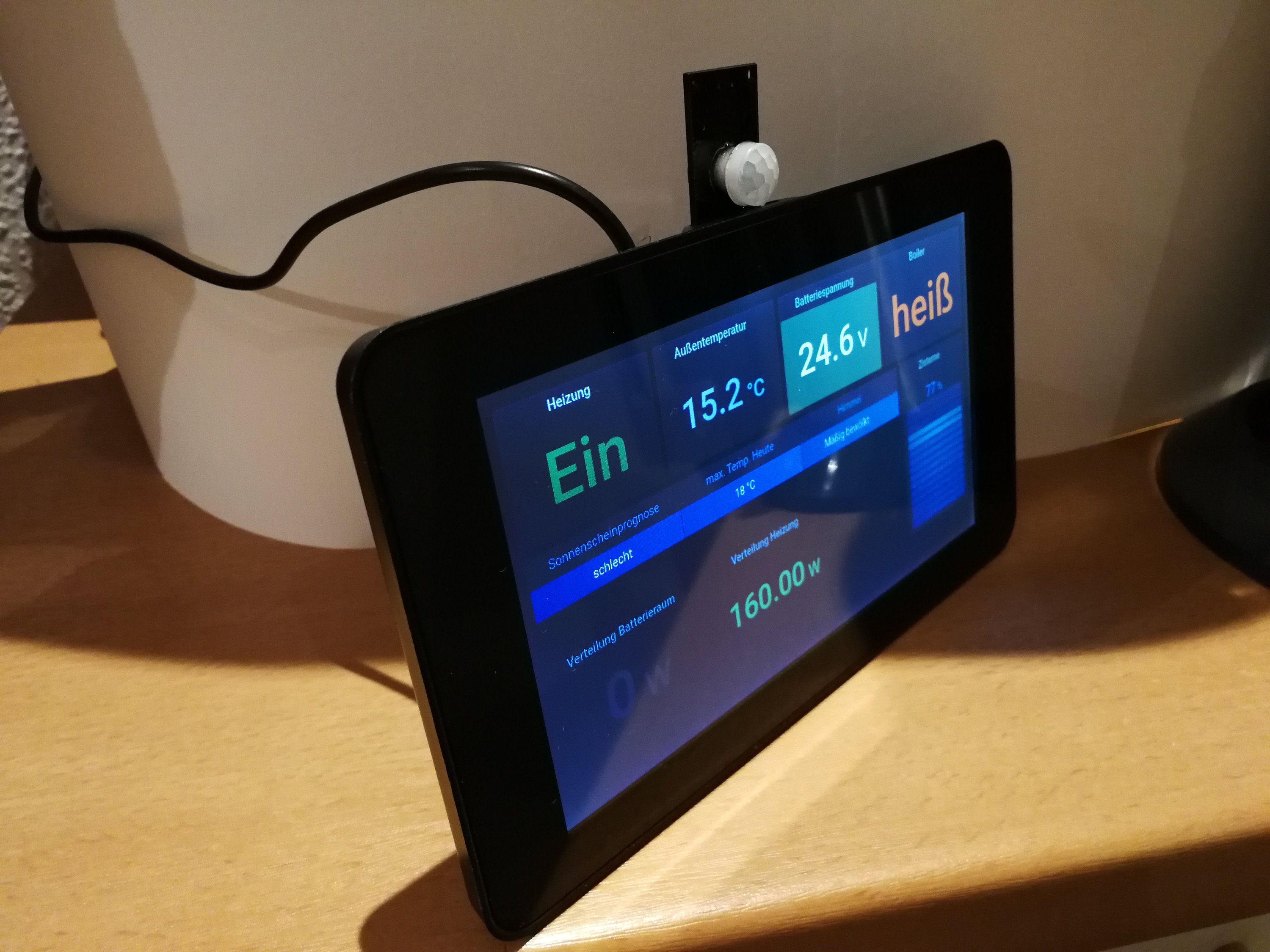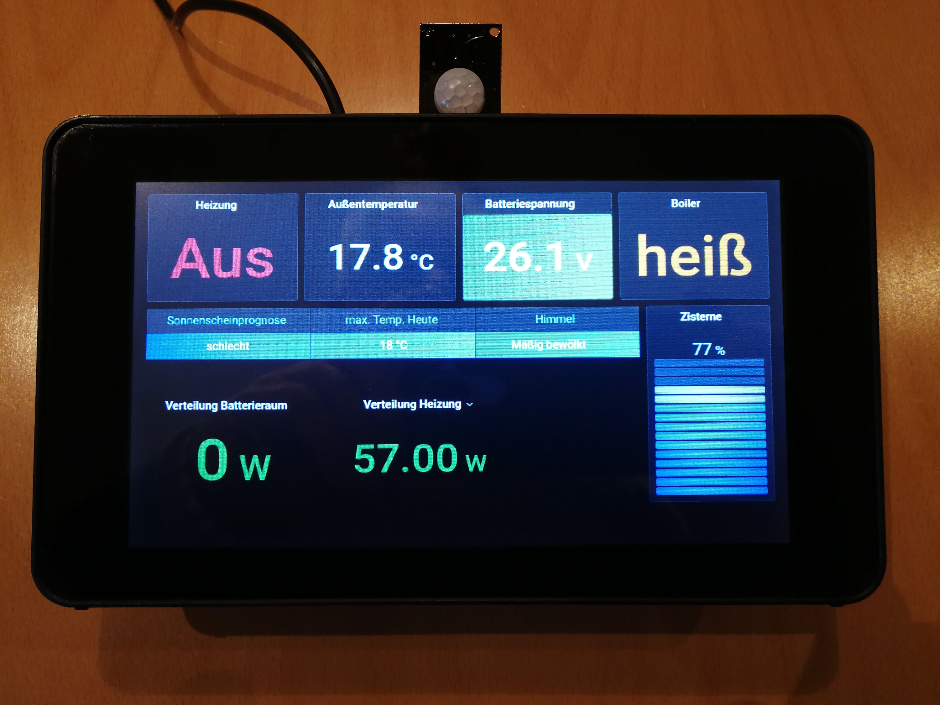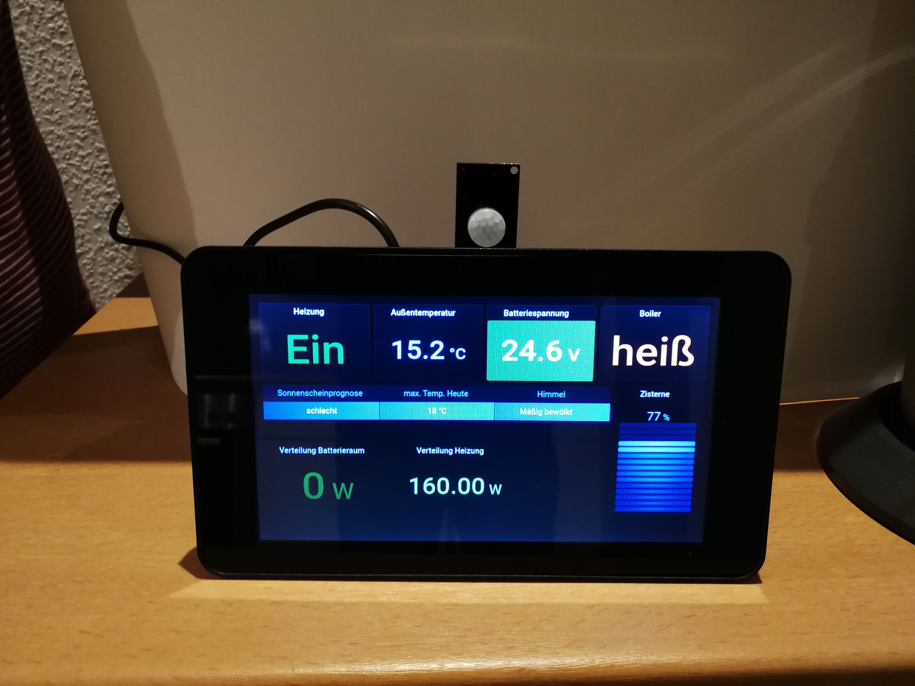 Cool, mit was lässt man sich den den Füllstand der Zisterne anzeigen?Ulrich hat geschrieben: ↑Fr 18. Dez 2020, 19:45Mit dem offiziellen 7" Touchscreen Bildschirm und einem kleinen Bewegungsmelder (PIR) kann man einfach und leicht einen Statusschirm herstellen, der normalerweise "aus" ist und bei Bewegung davor für 2 Minuten an geht.