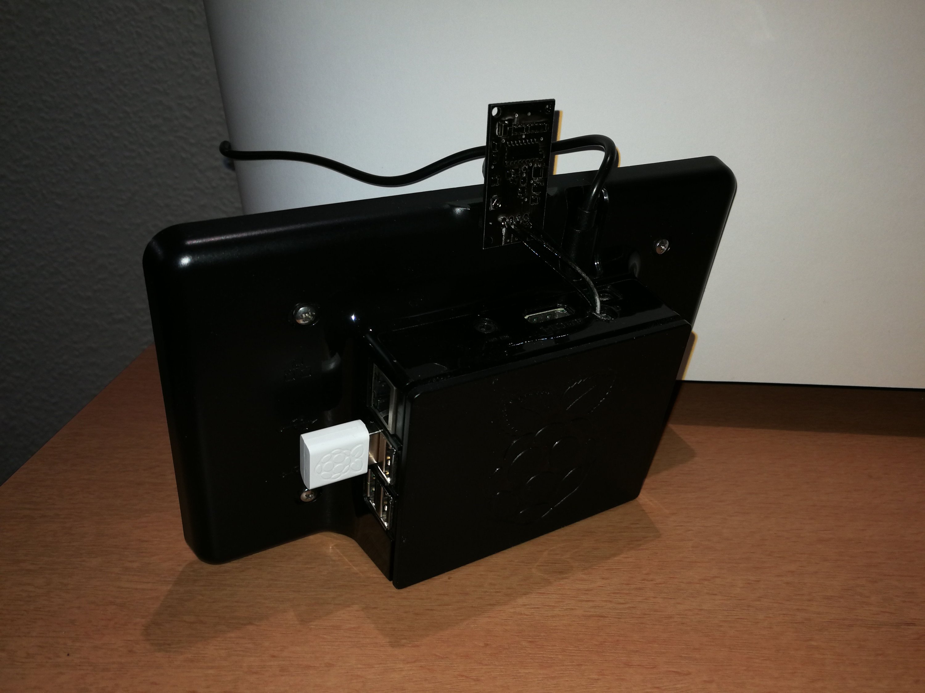 Mit dem offiziellen 7" Touchscreen Bildschirm und einem kleinen Bewegungsmelder (PIR) kann man einfach und leicht einen Statusschirm herstellen, der normalerweise "aus" ist und bei Bewegung davor für 2 Minuten an geht.