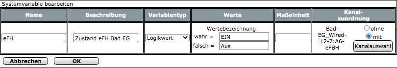 Ich habe bei mir in Homematic eine neue Systemvariable definiert, um den Status der elektrischen Fussbodenheizung letztendlich zur Solaranzeige zu übergeben.
